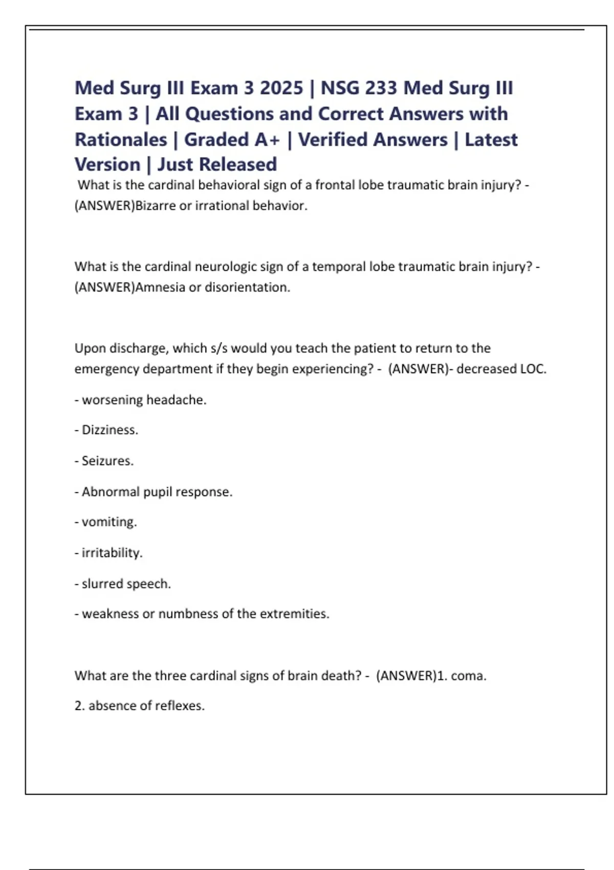Med Surg III Exam 3 2025 | NSG 233 Med Surg III Exam 3 | All Questions and Correct Answers with Rationales | Graded A+ | Verified Answers | Latest Version | Just Released