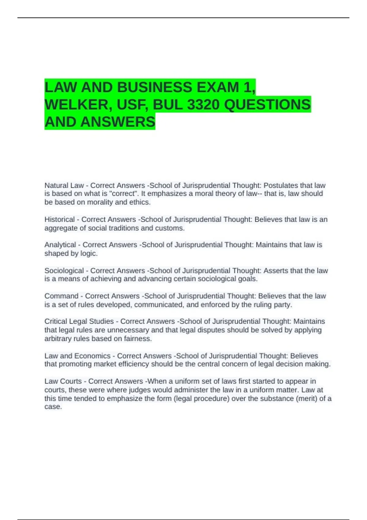 Natural Law - Correct Answers -School of Jurisprudential Thought: Postulates that law