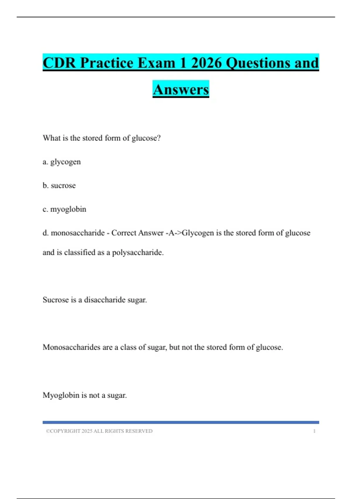 d. monosaccharide - Correct Answer -A->Glycogen is the stored form of glucose
