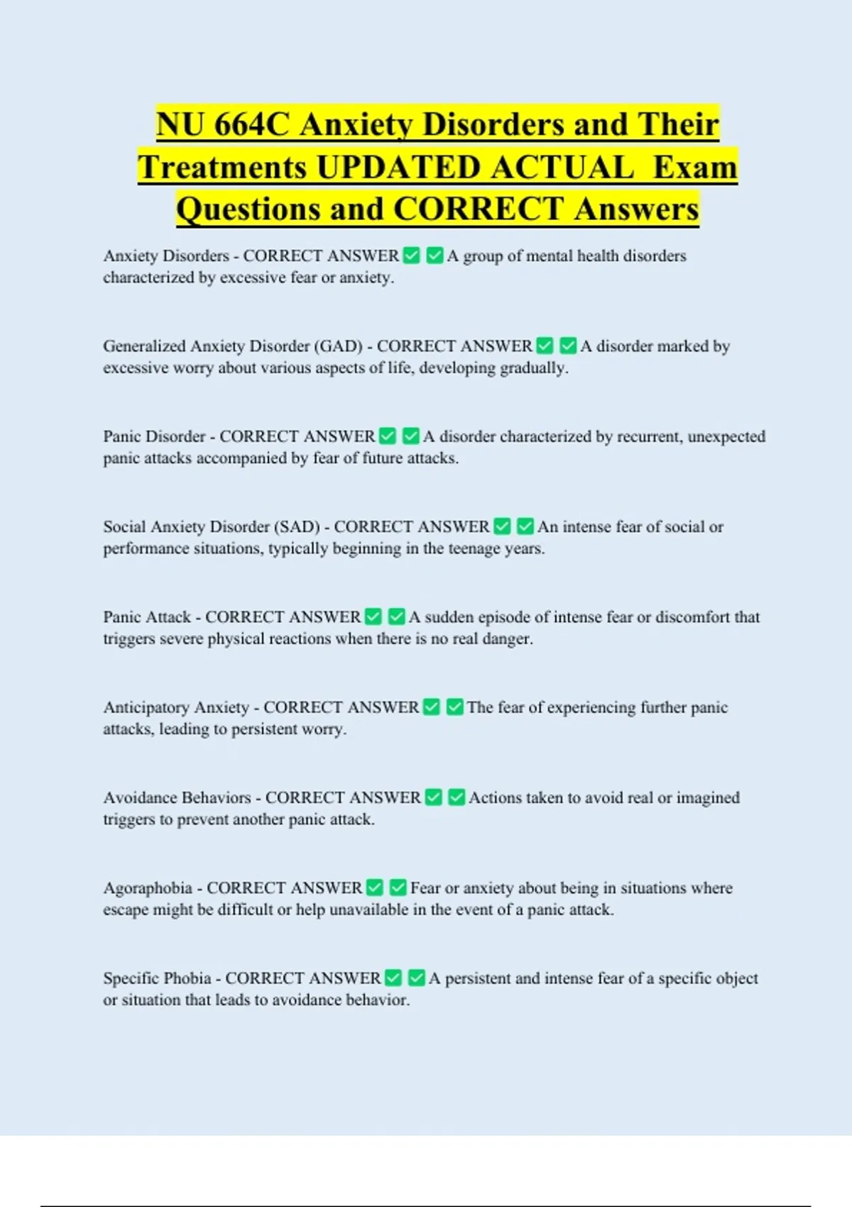 Anxiety Disorders - CORRECT ANSWER A group of mental health disorders