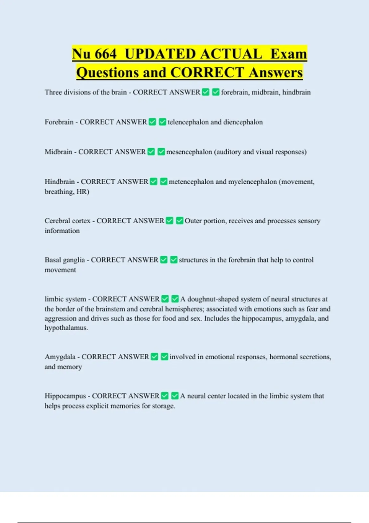 Nu 664 UPDATED ACTUAL Exam Questions and CORRECT Answers Three divisions of the brain - CORRECT ANSWER Forebrain - CORRECT ANSWER forebrain, midbrain, hindbrain telencephalon and diencephalon Midbrain - CORRECT ANSWER Hindbrain - CORRECT ANSWER breathing, HR) Cerebral cortex - CORRECT ANSWER information Basal ganglia - CORRECT ANSWER movement limbic system - CORRECT ANSWER mesencephalon (auditory and visual responses) metencephalon and myelencephalon (movemen