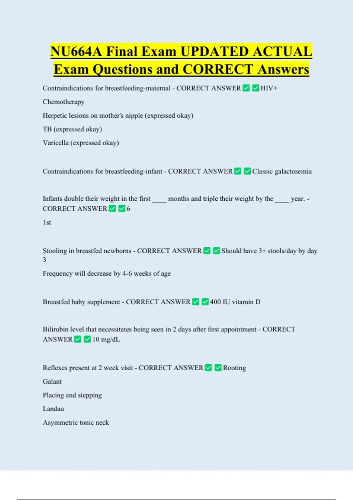 NU664A Final Exam UPDATED ACTUAL Exam Questions and CORRECT Answers Contraindications for breastfeeding-maternal - CORRECT ANSWER Chemotherapy Herpetic lesions on mother's nipple (expressed okay) TB (expressed okay) Varicella (expressed okay) Contraindications for breastfeeding-infant - CORRECT ANSWER HIV+ Classic galactosemia