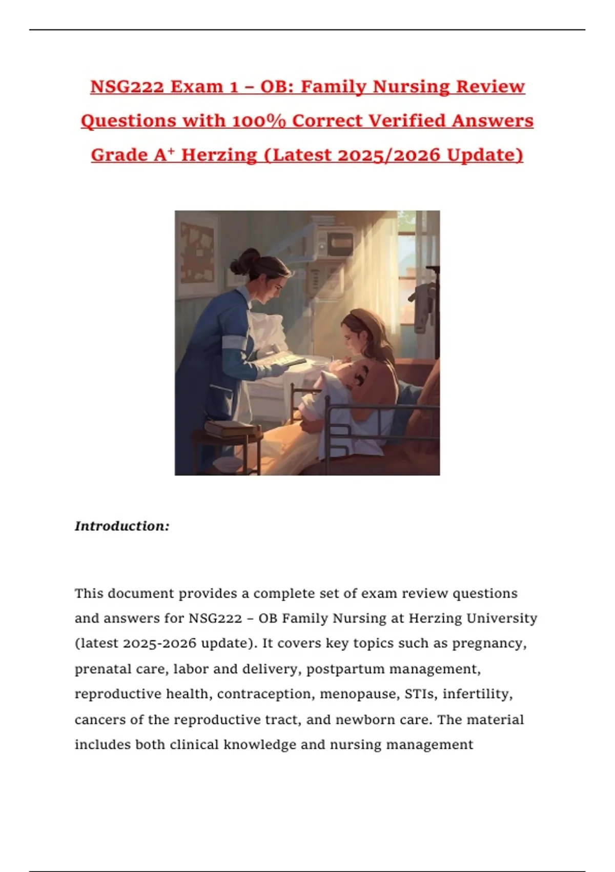 NSG222 Exam 1 – OB: Family Nursing Review Questions with 100% Correct Verified Answers Grade A+ Herzing (Latest 2025/2026 Update)