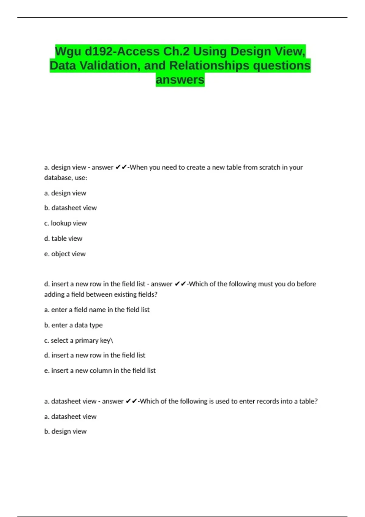 Wgu d192-Access Ch.2 Using Design View, Data Validation, and Relationships questions answers.