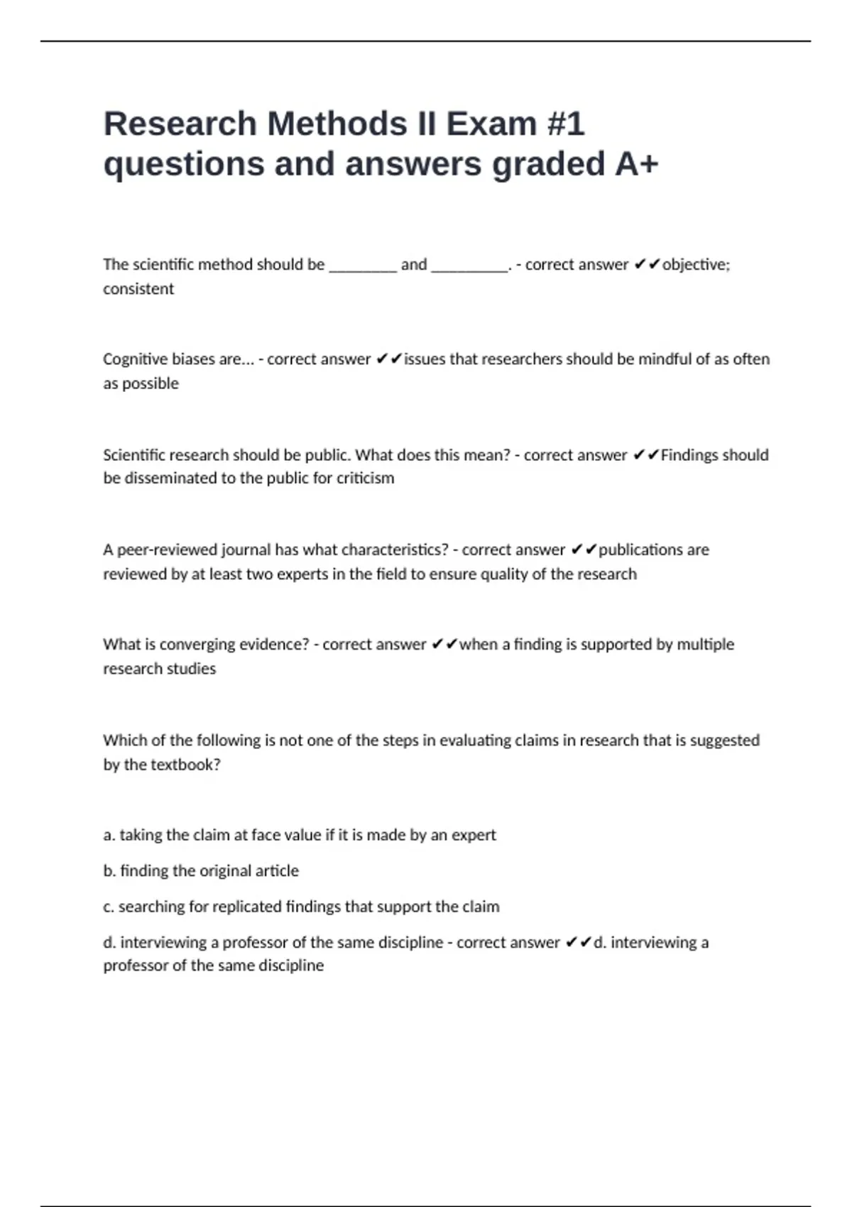 Research Methods II Exam #1 questions and answers graded A+The scientific method should be ________ and _________. - correct answer objective; consistent Cognitive biases are... - correct answer issues that researchers should be mindful of as often as possible Scientific research should be public. What does this mean? - correct answer Findings should be disseminated to the public for criticism A peer-reviewed journal has what characteristics? - correct answer publications are reviewed by at least two experts in the field to ensure quality of the research What is converging evidence? - correct answer when a finding is supported by multiple research studies Which of the following is not one of the steps in evaluating claims in research that is suggested by the textbook? a. taking the claim at face value if it is made by an expert b. finding the original article c. searching for replicated findings that support the claim d. interviewing a professor of the same discipline - correct answer d. interviewing a professor of the same discipline