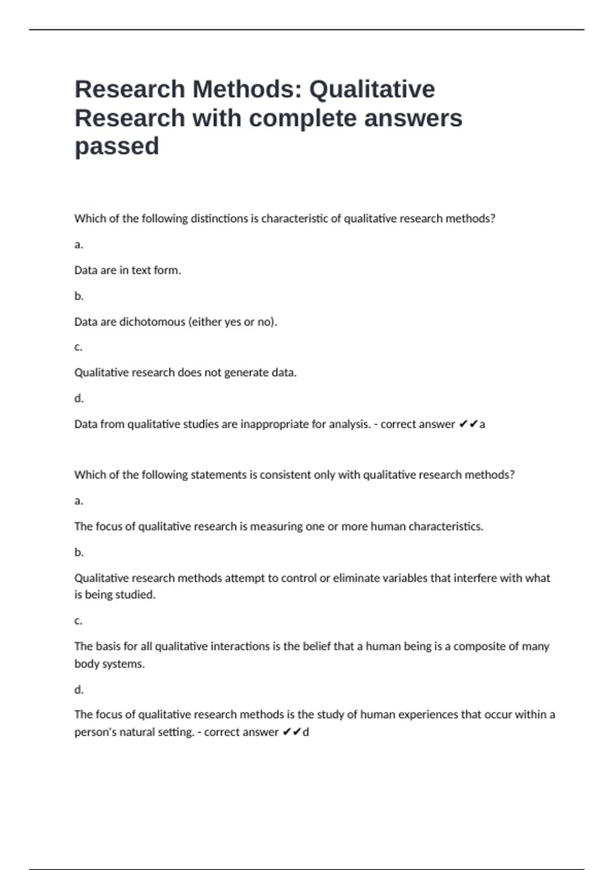 Research Methods: Qualitative Research with complete answers passedWhich of the following distinctions is characteristic of qualitative research methods? a. Data are in text form. b. Data are dichotomous (either yes or no). c. Qualitative research does not generate data. d. Data from qualitative studies are inappropriate for analysis. - correct answer a Which of the following statements is consistent only with qualitative research methods? a. The focus of qualitative research is measuring one or more human characteristics. b. Qualitative research methods attempt to control or eliminate variables that interfere with what is being studied. c. The basis for all qualitative interactions is the belief that a human being is a composite of many body systems. d.