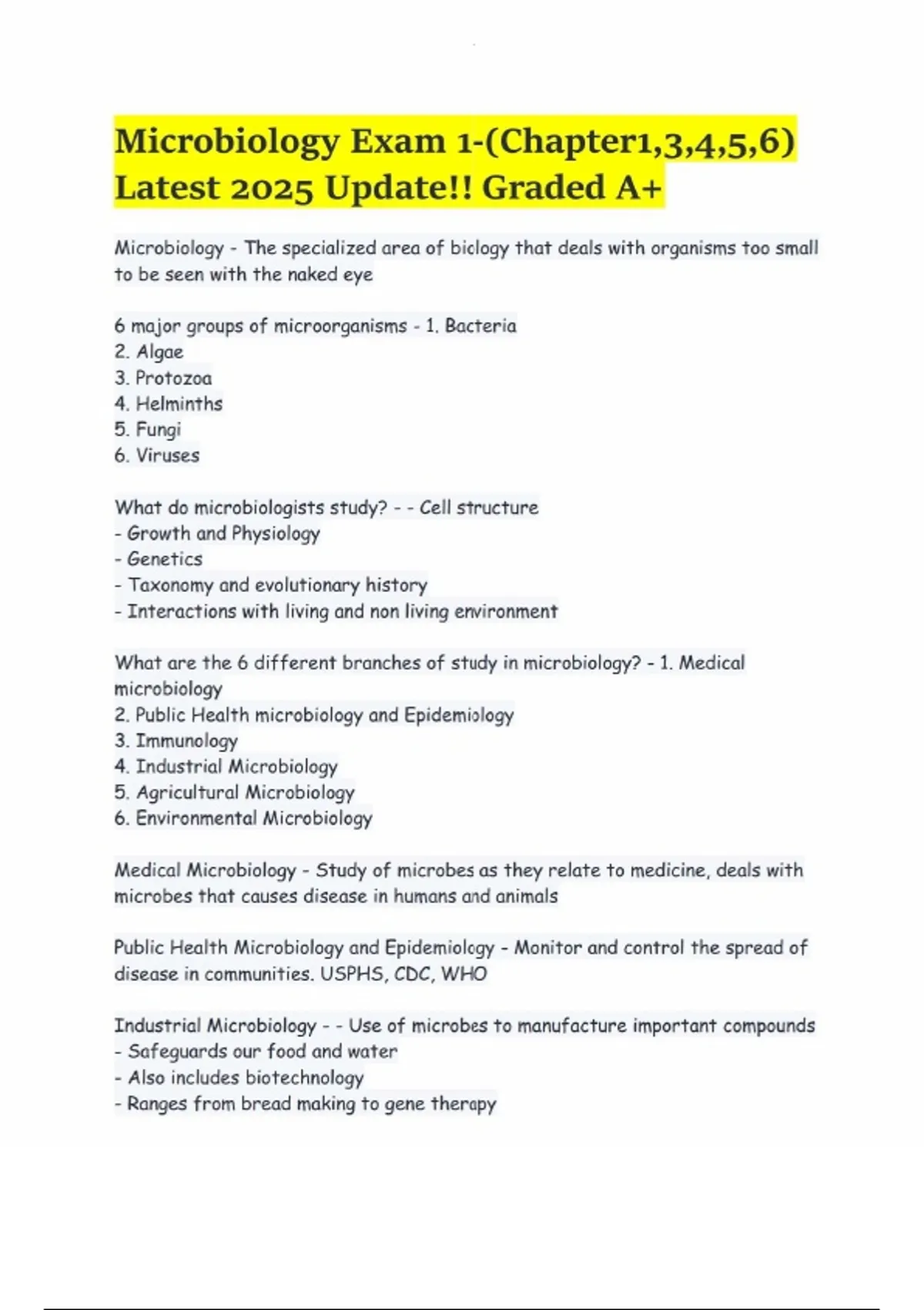 This extensive review for Microbiology Exam 1 covers Chapters 1, 3, 4, 5, and 6, providing a detailed overview of microbial classification, structure, function, and laboratory methods. The document includes verified questions and answers on topics such as bacterial and viral morphology, microscopy, staining techniques, endospore formation, eukaryotic cell structure, and viral life cycles. Ideal for students preparing for exams in microbiology, this resource reinforces understanding of key concepts, laboratory procedures, and the role of microbes in health and disease. Perfect for college-level microbiology courses, USMLE Step 1, or NCLEX preparation.