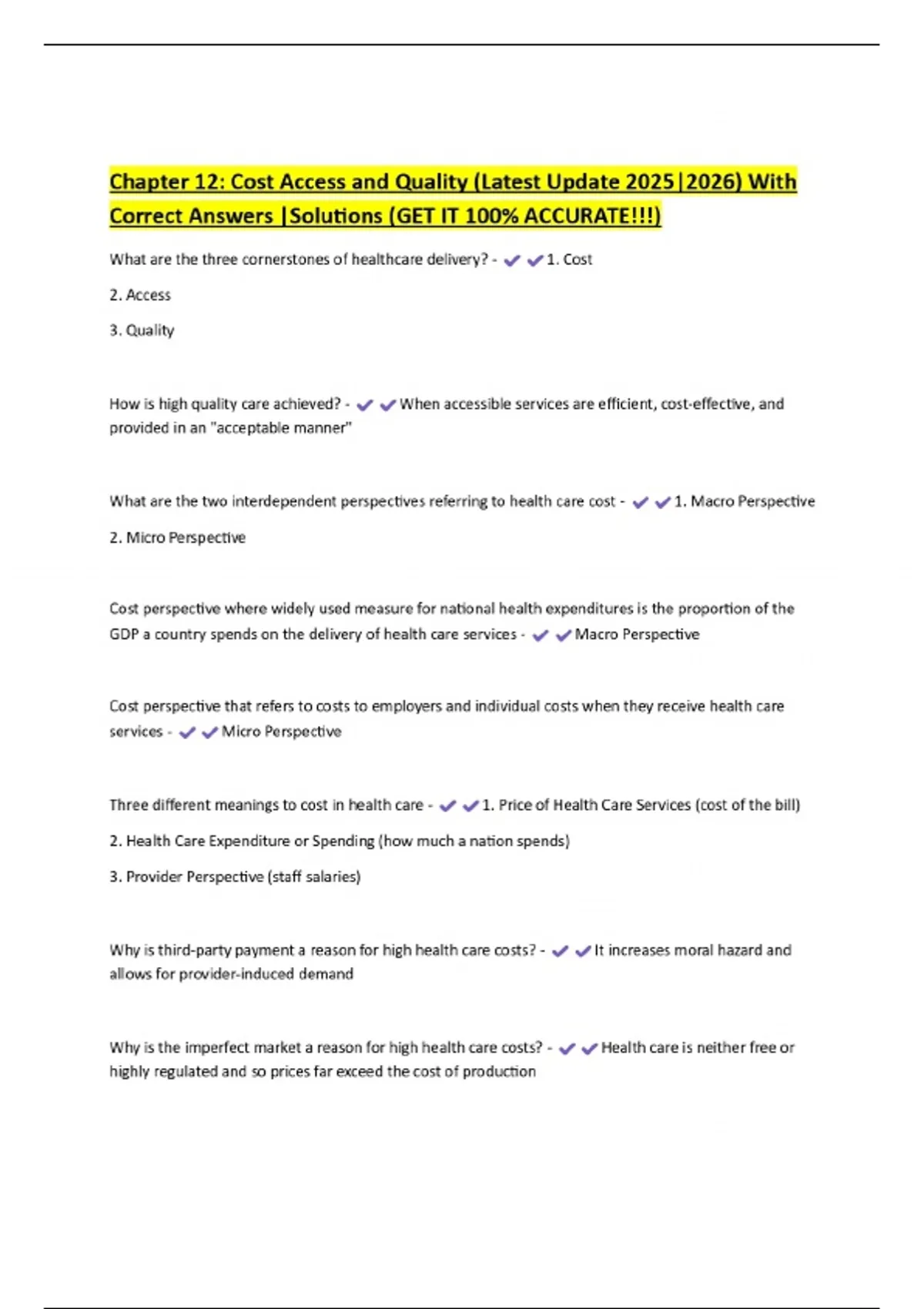 Chapter 12: Cost Access and Quality (Latest Update 2025|2026) With Correct Answers |Solutions (GET IT 100% ACCURATE!!!)
