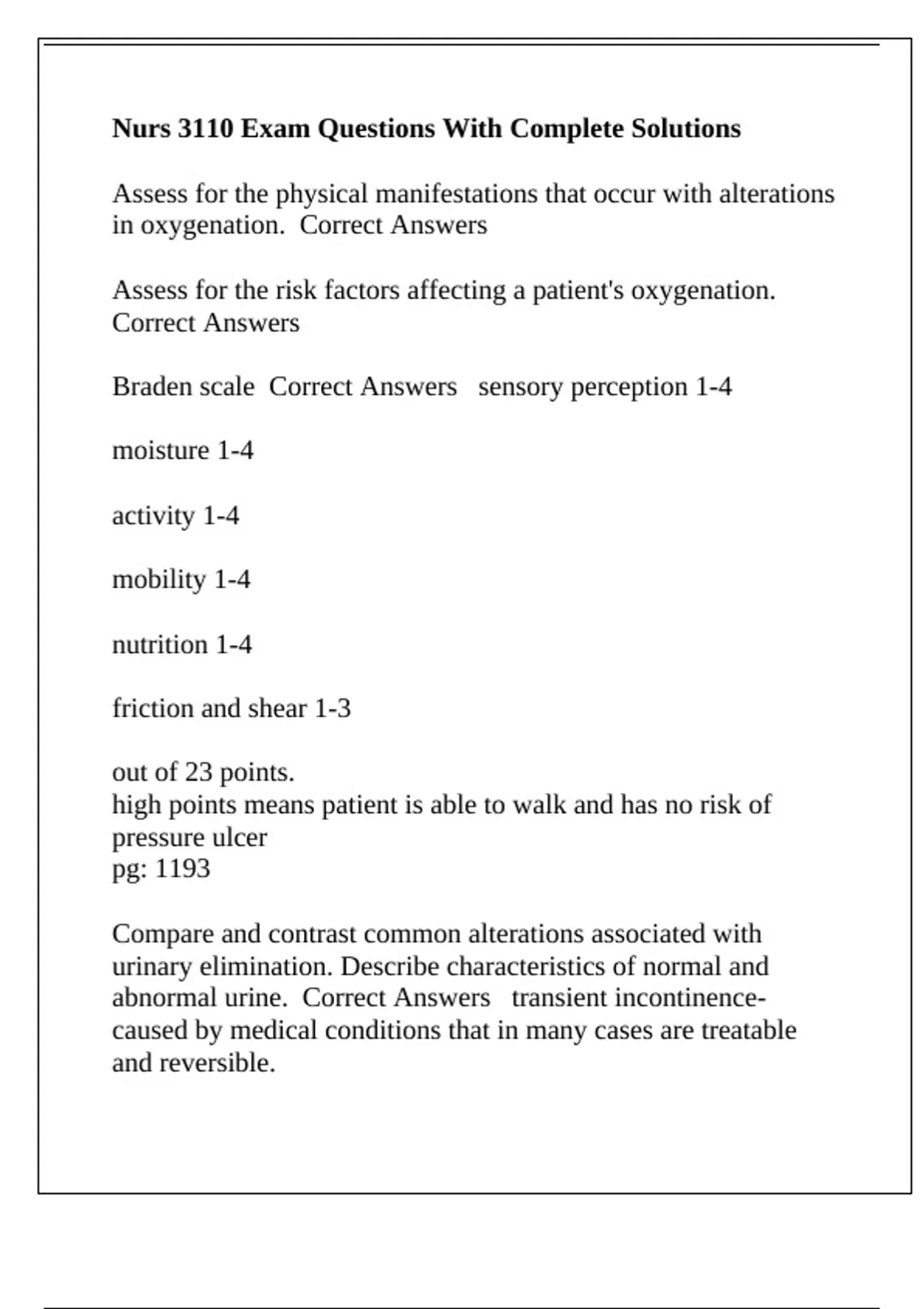 Braden scale Correct Answers sensory perception 1-4