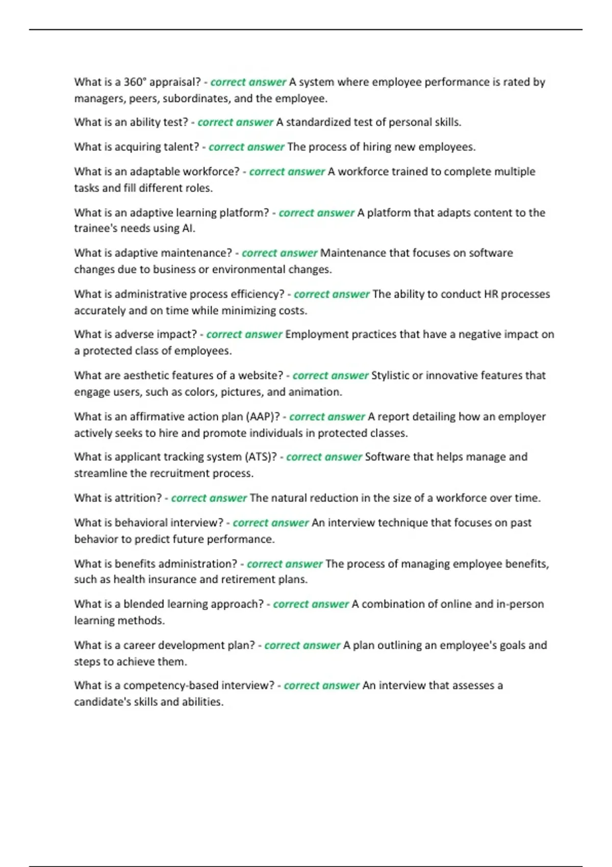 What is a 360° appraisal? - correct answer A system where employee performance is rated by managers, peers, subordinates, and the employee. What is an ability test? - correct answer A standardized test of personal skills. What is acquiring talent? - correct answer The process of hiring new employees. What is an adaptable workforce? - correct answer A workforce trained to complete multiple tasks and fill different roles. What is an adaptive learning platform? - correct answer A platform that adapts content to the trainee's needs using AI. What is adaptive maintenance? - correct answer Maintenance that focuses on software changes due to business or environmental changes. What is administrative process efficiency? - correct answer The ability to conduct HR processes accurately and on time while minimizing costs. What is adverse impact? - correct answer Employment practices that have a negative impact on a protected class of employees.