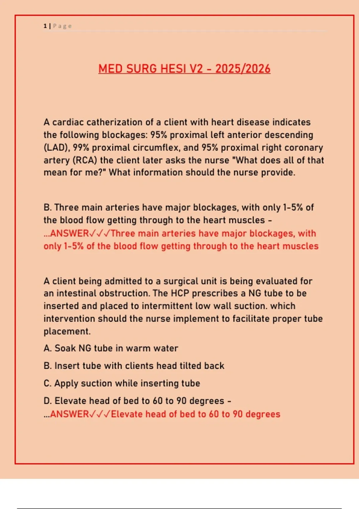 Prepare for the MED SURG HESI V2 exam with this updated 2025/2026 question bank. Includes detailed answers and rationales covering cardiac, respiratory, endocrine, GI, GU, neuro, and post-op care scenarios. Ideal for nursing students seeking to master clinical judgment and boost exam scores. Download now for targeted practice and confidence on test day!
