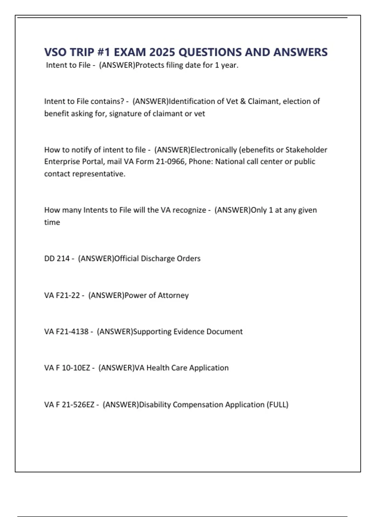 How many Intents to File will the VA recognize - (ANSWER)Only 1 at any given