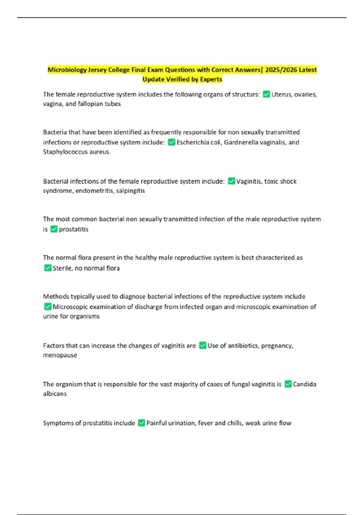 Microbiology Jersey College Final Exam Questions with Correct Answers| 2025/2026 Latest Update Verified by Experts