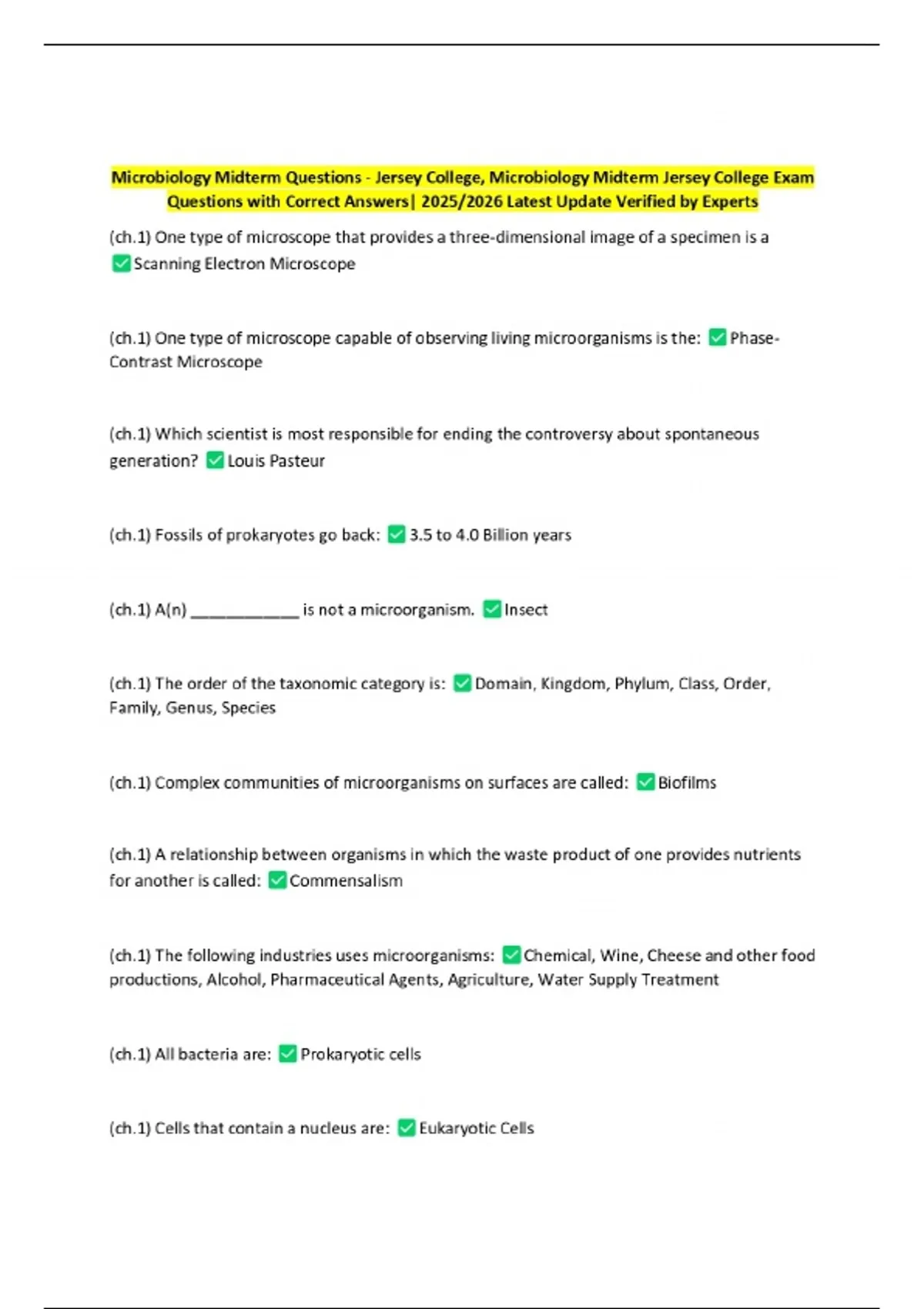 Microbiology Midterm Questions - Jersey College, Microbiology Midterm Jersey College Exam Questions with Correct Answers| 2025/2026 Latest Update Verified by Experts
