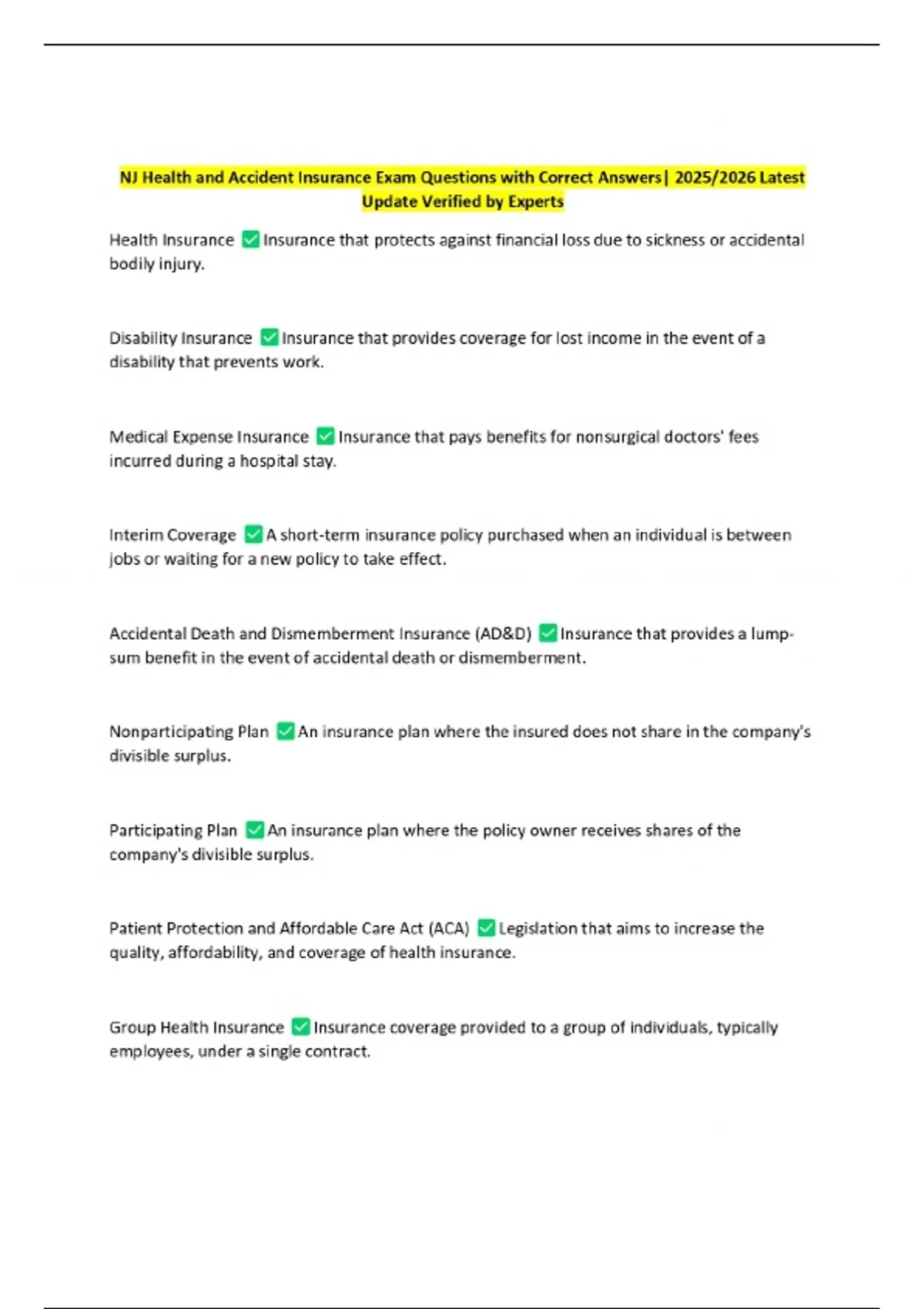 NJ Health and Accident Insurance Exam Questions with Correct Answers| 2025/2026 Latest Update Verified by Experts