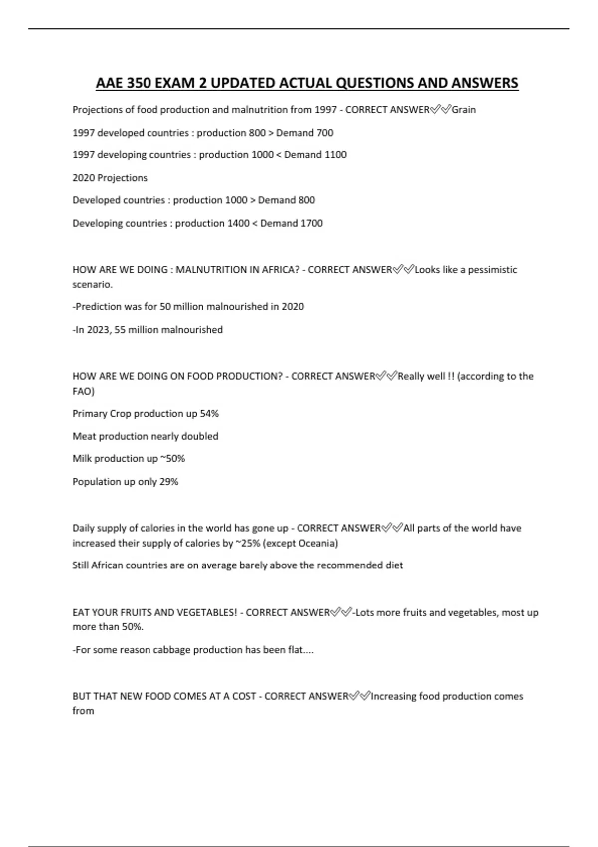 AAE 350 EXAM 2 UPDATED ACTUAL QUESTIONS AND ANSWERS Projections of food production and malnutrition from 1997 - CORRECT ANSWERGrain 1997 developed countries : production 800 Demand 700 1997 developing countries : production 1000 Demand 1100 2020 Projections Developed countries : production 1000 Demand 800 Developing countries : production 1400 Demand 1700