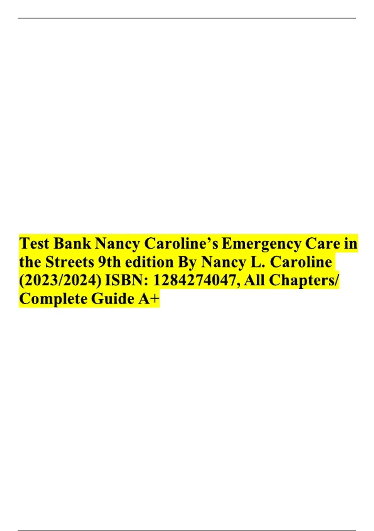 Test Bank For Nancy Caroline’s Emergency Care in the Streets, 9th Edition by Nancy Caroline, All Chapters 1 - 53 LATEST Test Bank For Nancy Caroline’s Emergency Care in the Streets, 9th Edition by Nancy Caroline, All Chapters 1 - 53 LATEST Test Bank For Nancy Caroline’s Emergency Care in the Streets, 9th Edition by Nancy Caroline, All Chapters 1 - 53 LATEST Test Bank For Nancy Caroline’s Emergency Care in the Streets, 9th Edition by Nancy Caroline, All Chapters 1 - 53 LATEST Test Bank For Nancy Caroline’s Emergency Care in the Streets, 9th Edition by Nancy Caroline, All Chapters 1 - 53 LATEST