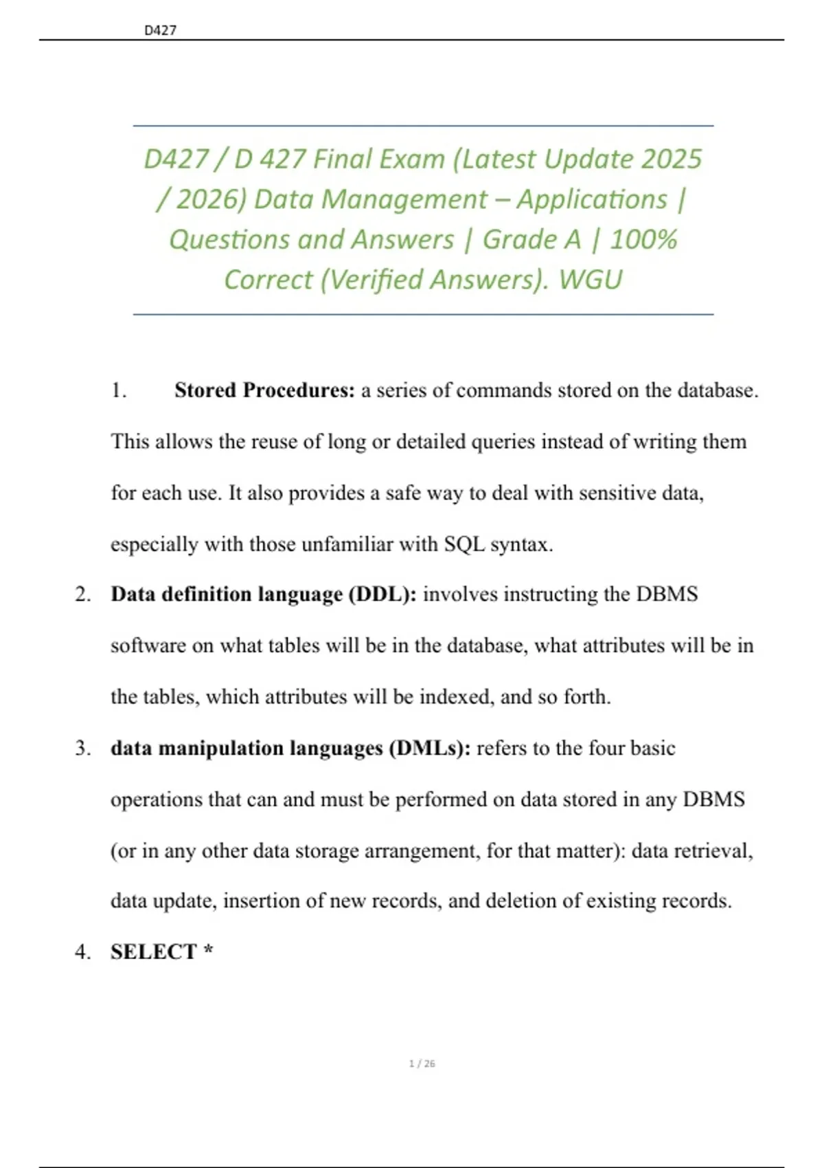 D427 / D 427 Final Exam (Latest Update 2025 / 2026) Data Management – Applications | Questions and Answers | Grade A | 100% Correct (Verified Answers). WGU