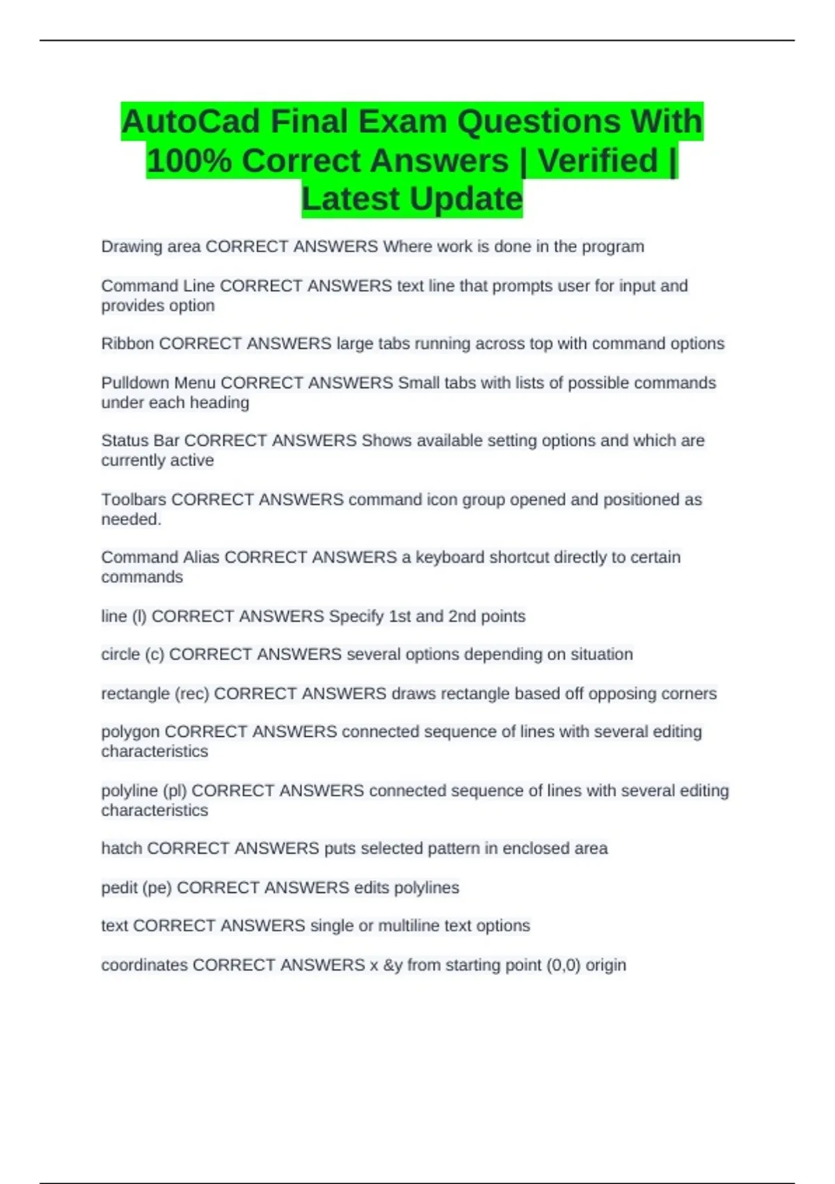 AutoCad Final Exam Questions With 100% Correct Answers | Verified | Latest Update