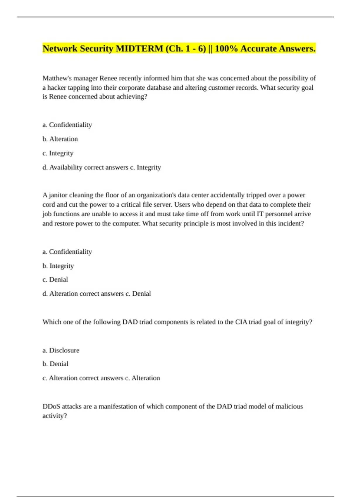 Matthew's manager Renee recently informed him that she was concerned about the possibility of a hacker tapping into their corporate database and altering customer records. What security goal is Renee concerned about achieving? a. Confidentiality b. Alteration c. Integrity d. Availability correct answers c. Integrity A janitor cleaning the floor of an organization's data center accidentally tripped over a power cord and cut the power to a critical file server. Users who depend on that data to complete their job functions are unable to access it and must take time off from work until IT personnel arrive and restore power to the computer. What security principle is most involved in this incident? a. Confidentiality b. Integrity c. Denial d. Alteration correct answers c. Denial Which one of the following DAD triad components is related to the CIA triad goal of integrity? a. Disclosure b. Denial c. Alteration correct answers c. Alteration DDoS attacks are a manifestation of which component of the DAD triad model of malicious activity?