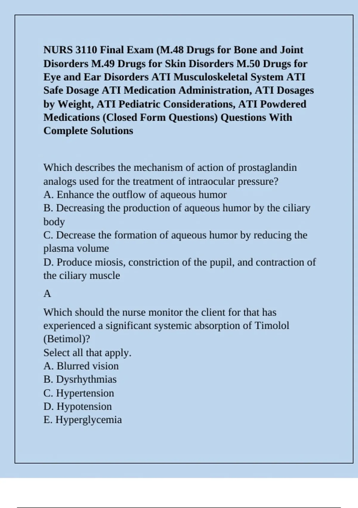 NURS 3110 Final Exam (M.48 Drugs for Bone and Joint Disorders M.49 Drugs for Skin Disorders M.50 Drugs for Eye and Ear Disorders ATI Musculoskeletal System ATI Safe Dosage ATI Medication Administration, ATI Dosages by Weight, ATI Pediatric Considerations, ATI Powdered Medications (Closed Form Questions) Questions With Complete Solutions