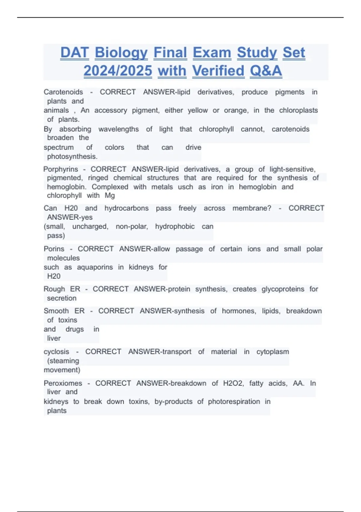 Peroxiomes nn- nnCORRECT nnANSWER-breakdown nnof nnH2O2, nnfatty nnacids, nnAA. nnIn