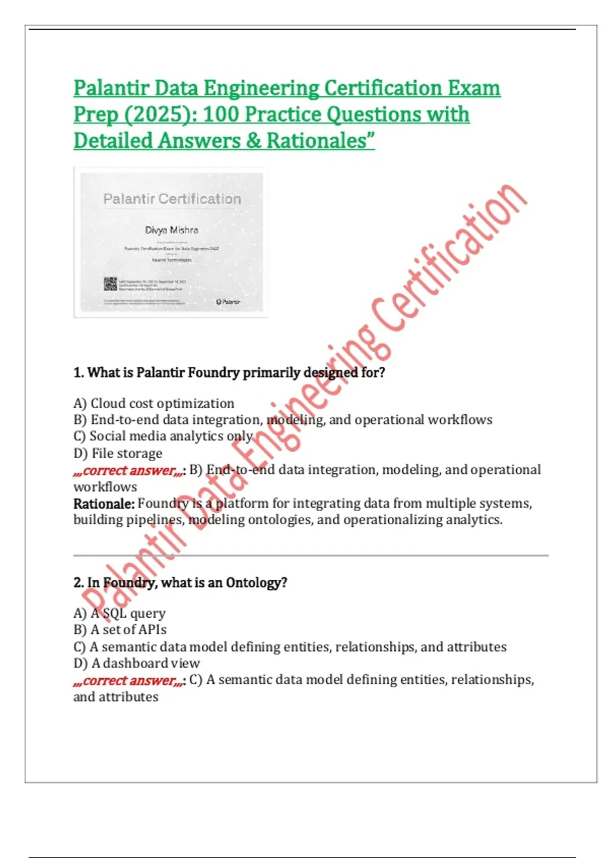 Palantir Data Engineering Certification Exam Prep (2025): 100 Practice Questions with Detailed Answers & Rationales”