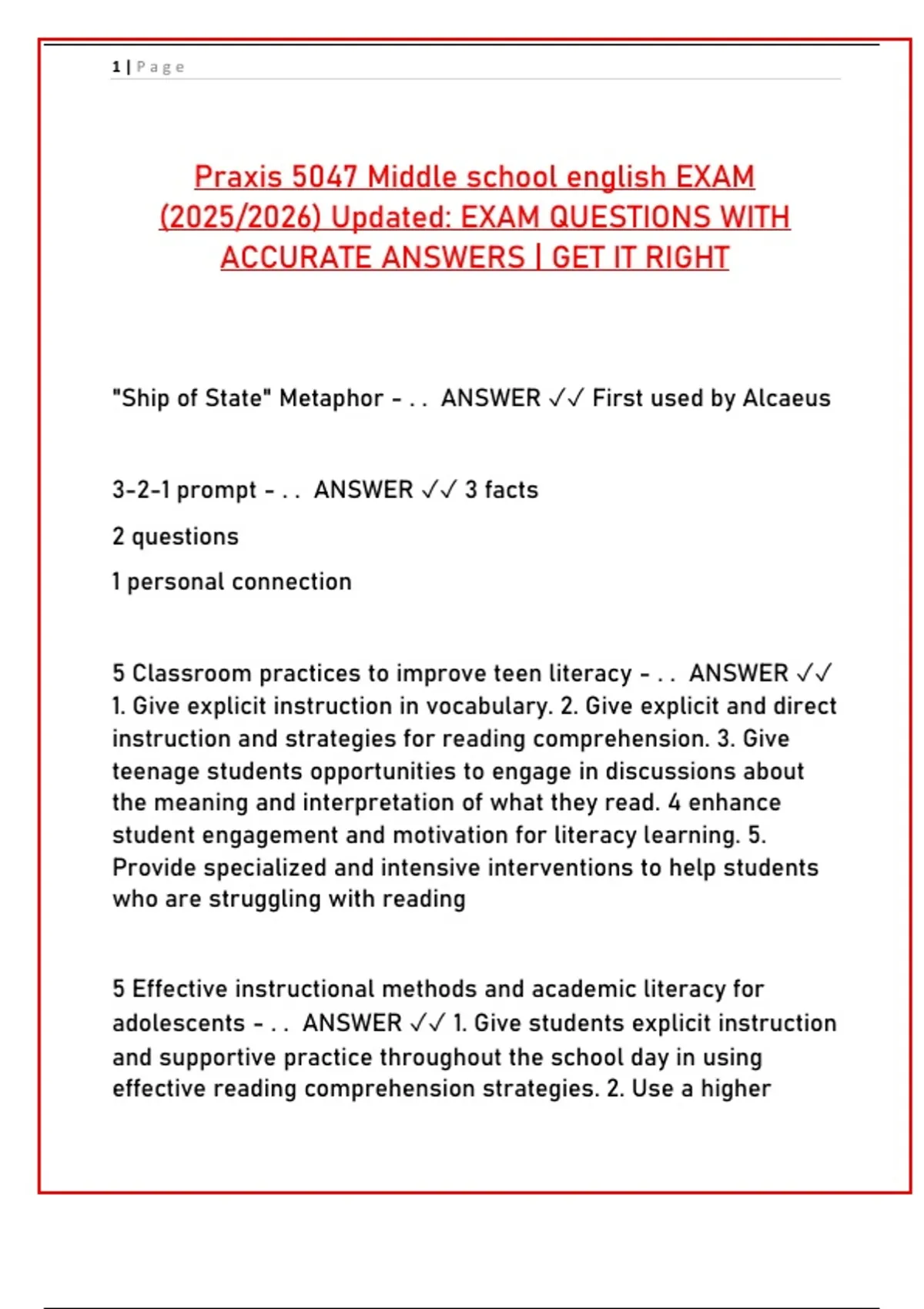 Praxis 5047 Middle School English Exam (2025/2026) – Updated Questions & Accurate Answers