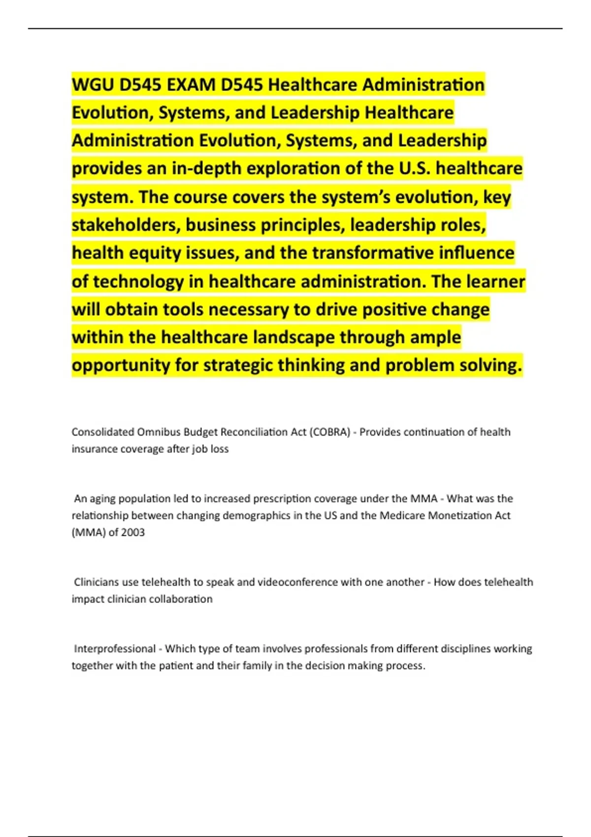 WGU D545 EXAM D545 Healthcare Administration Evolution, Systems, and Leadership Healthcare Administration Evolution, Systems, and Leadership provides an in-depth exploration of the U.S. healthcare system. The course covers the system’s evolution, key stakeholders, business principles, leadership roles, health equity issues, and the transformative influence of technology in healthcare administration. The learner will obtain tools necessary to drive positive change within the healthcare landscape through ample opportunity for strategic thinking and problem solving. WGU D545 EXAM D545 Healthcare Administration Evolution, Systems, and Leadership Healthcare Administration Evolution, Systems, and Leadership provides an in-depth exploration of the U.S. healthcare system. The course covers the system’s evolution, key stakeholders, business principles, leadership roles, health equity issues, and the transformative influence of technology in healthcare administration. The learner will obtain tools necessary to drive positive change within the healthcare landscape through ample opportunity for strategic thinking and problem solving. WGU D545 EXAM D545 Healthcare Administration Evolution, Systems, and Leadership Healthcare Administration Evolution, Systems, and Leadership provides an in-depth exploration of the U.S. healthcare system. The course covers the system’s evolution, key stakeholders, business principles, leadership roles, health equity issues, and the transformative influence of technology in healthcare administration. The learner will obtain tools necessary to drive positive change within the healthcare landscape through ample opportunity for strategic thinking and problem solving. WGU D545 EXAM D545 Healthcare Administration Evolution, Systems, and Leadership Healthcare Administration Evolution, Systems, and Leadership provides an in-depth exploration of the U.S. healthcare system. The course covers the system’s evolution, key stakeholders, business principles, leadership roles, health equity issues, and the transformative influence of technology in healthcare administration. The learner will obtain tools necessary to drive positive change within the healthcare landscape through ample opportunity for strategic thinking and problem solving. WGU D545 EXAM D545 Healthcare Administration Evolution, Systems, and Leadership Healthcare Administration Evolution, Systems, and Leadership provides an in-depth exploration of the U.S. healthcare system. The course covers the system’s evolution, key stakeholders, business principles, leadership roles, health equity issues, and the transformative influence of technology in healthcare administration. The learner will obtain tools necessary to drive positive change within the healthcare landscape through ample opportunity for strategic thinking and problem solving.