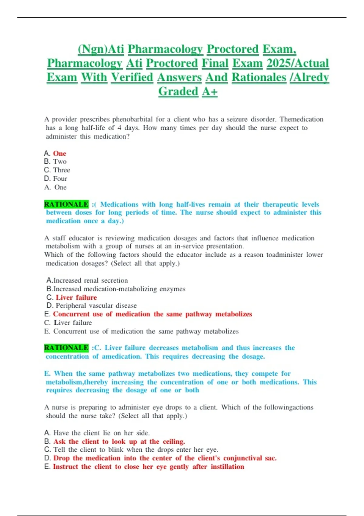 (Ngn)Ati Pharmacology Proctored Exam, Pharmacology Ati Proctored Final Exam 2025/Actual Exam With Verified Answers And Rationales /Alredy Graded A+