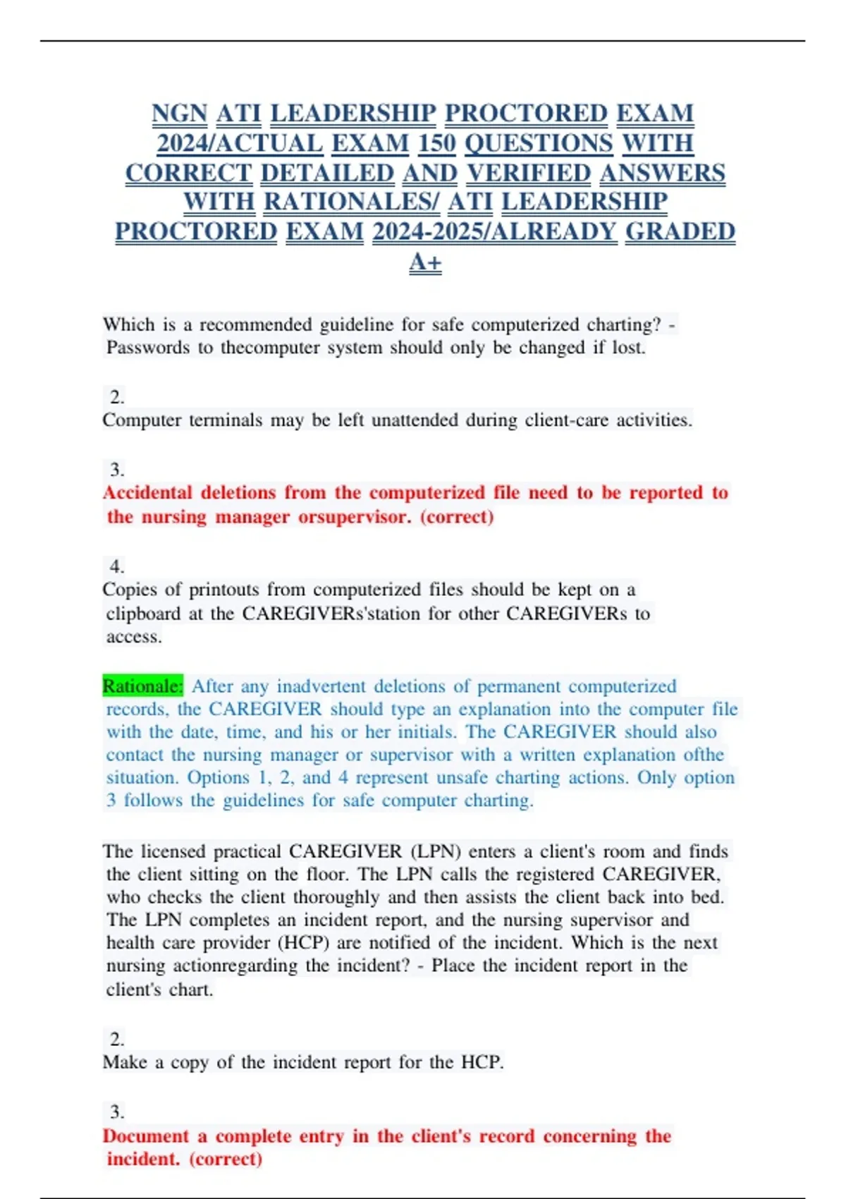 NGN ATI LEADERSHIP PROCTORED EXAM 2024/ACTUAL EXAM 150 QUESTIONS WITH CORRECT DETAILED AND VERIFIED ANSWERS WITH RATIONALES/ ATI LEADERSHIP PROCTORED EXAM /ALREADY GRADED A+