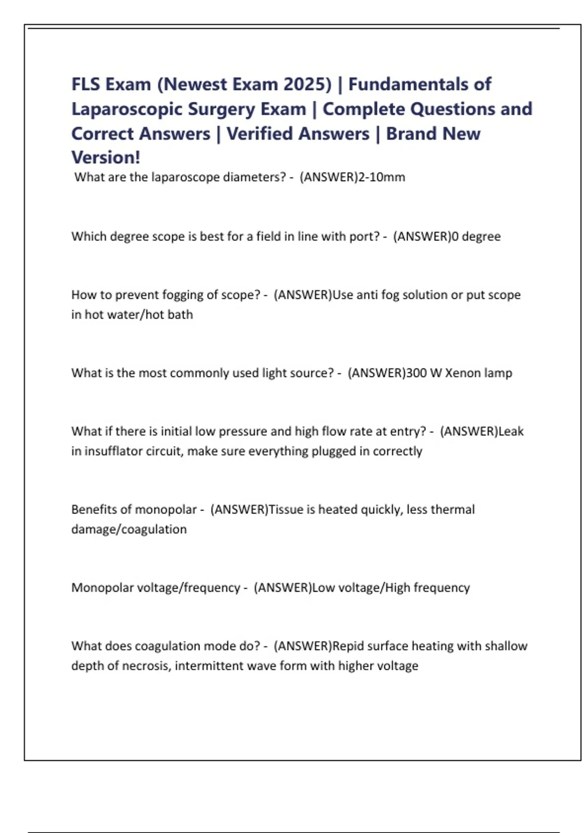 FLS Exam (Newest Exam 2025) | Fundamentals of Laparoscopic Surgery Exam | Complete Questions and Correct Answers | Verified Answers | Brand New Version!