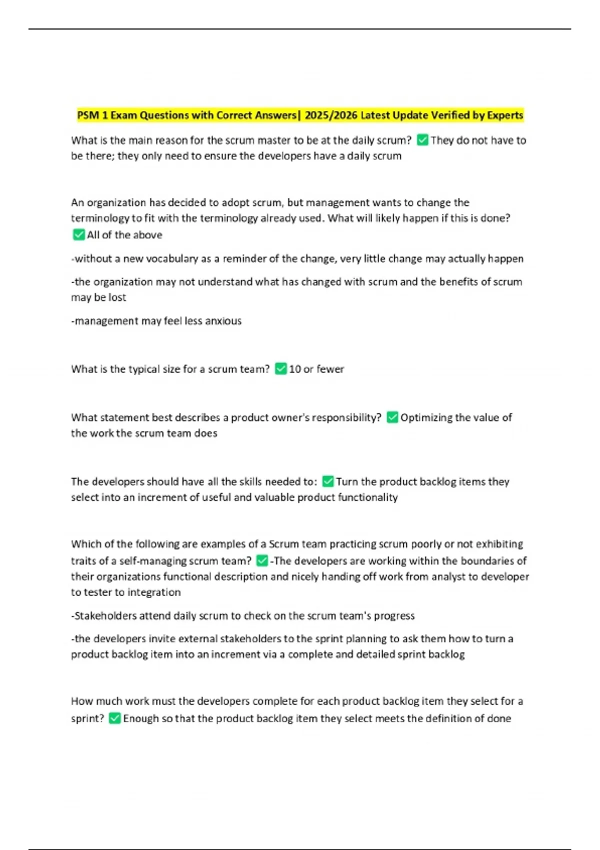 PSM 1 Exam Questions with Correct Answers| 2025/2026 Latest Update Verified by Experts