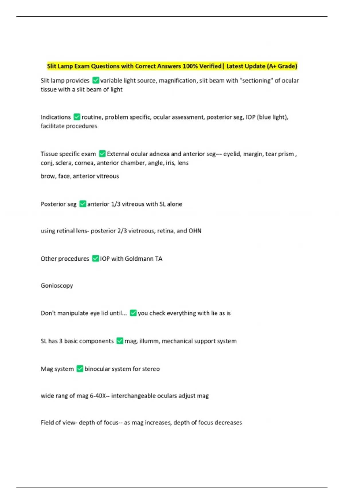 Slit Lamp Exam Questions with Correct Answers 100% Verified| Latest Update (A+ Grade)