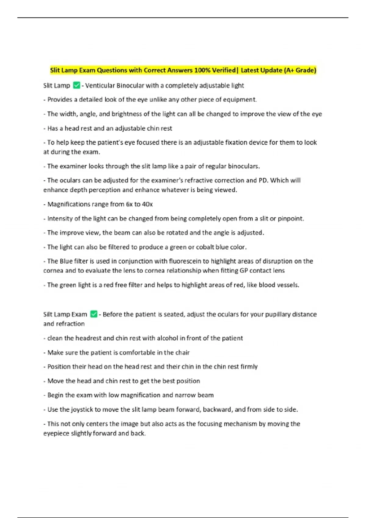 Slit Lamp Exam Questions with Correct Answers 100% Verified| Latest Update (A+ Grade)