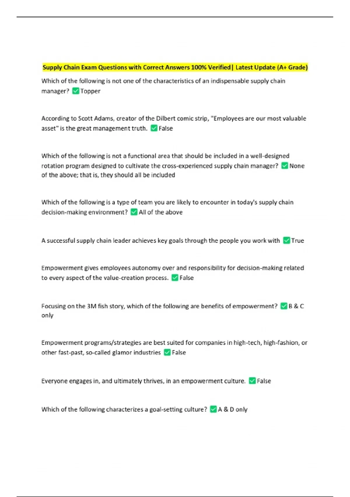 Supply Chain Exam Questions with Correct Answers 100% Verified| Latest Update (A+ Grade)