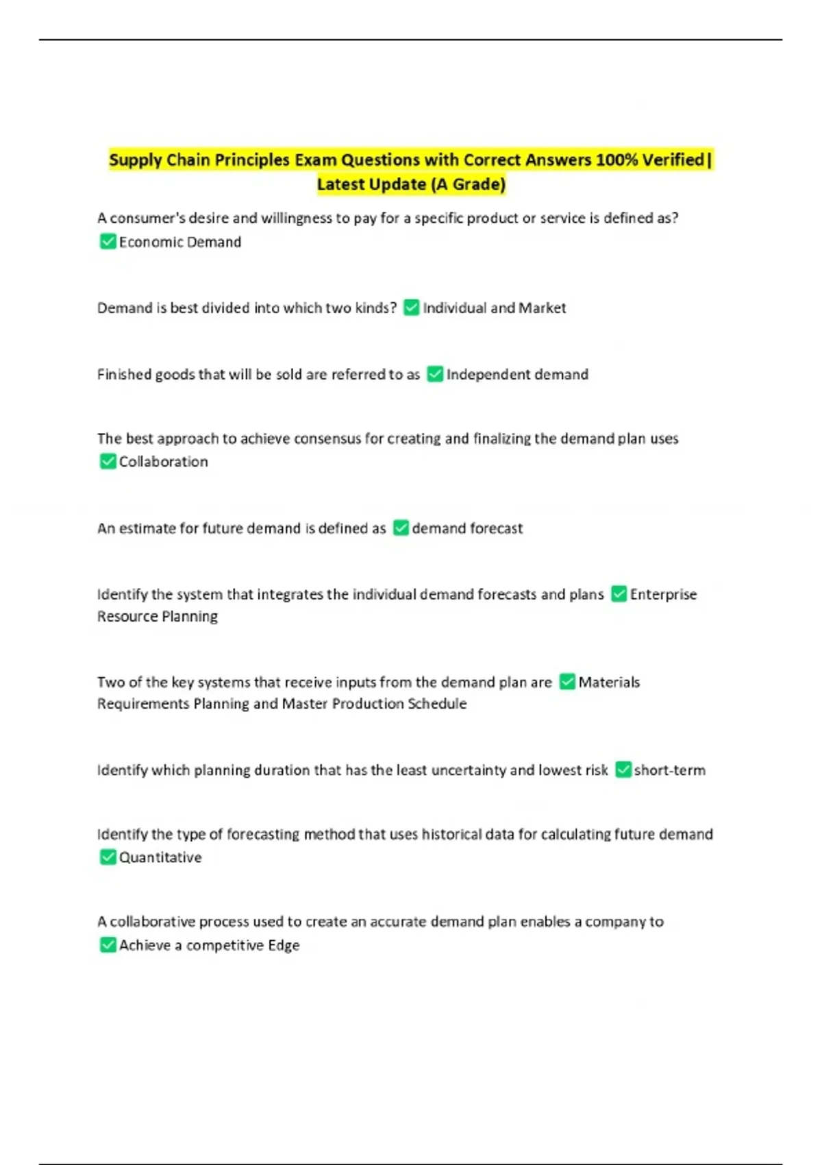 Supply Chain Principles Exam Questions with Correct Answers 100% Verified| Latest Update (A Grade)