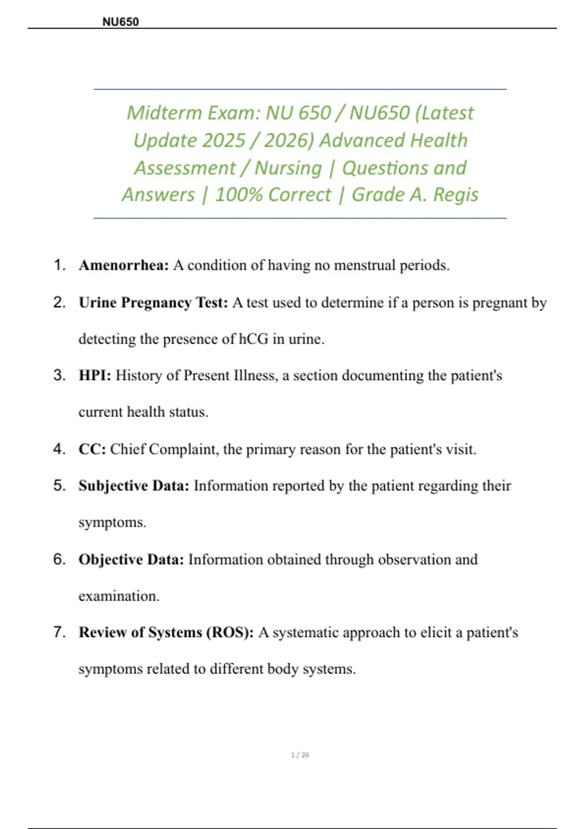 Midterm Exam: NU 650 / NU650 (Latest Update 2025 / 2026) Advanced Health Assessment / Nursing | Questions and Answers | 100% Correct | Grade A. Regis