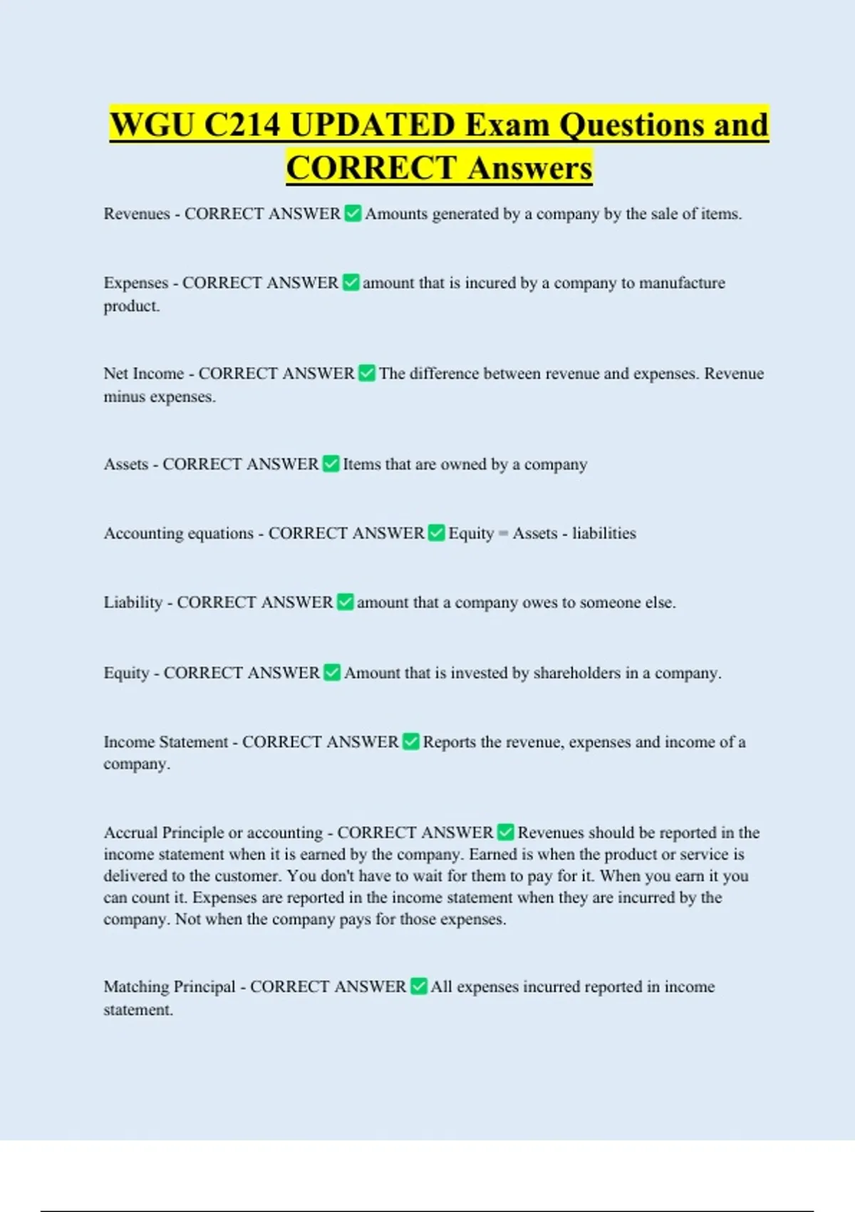 WGU C214 UPDATED Exam Questions and CORRECT Answers Revenues - CORRECT ANSWER Amounts generated by a company by the sale of items. Expenses - CORRECT ANSWER amount that is incured by a company to manufacture product. Net Income - CORRECT ANSWER The difference between revenue and expenses. Revenue minus expenses. Assets - CORRECT ANSWER Items that are owned by a company