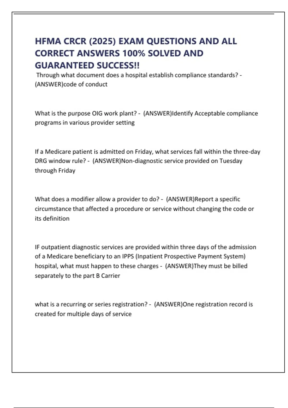 HFMA CRCR (2025) EXAM QUESTIONS AND ALL CORRECT ANSWERS 100% SOLVED AND GUARANTEED SUCCESS!!