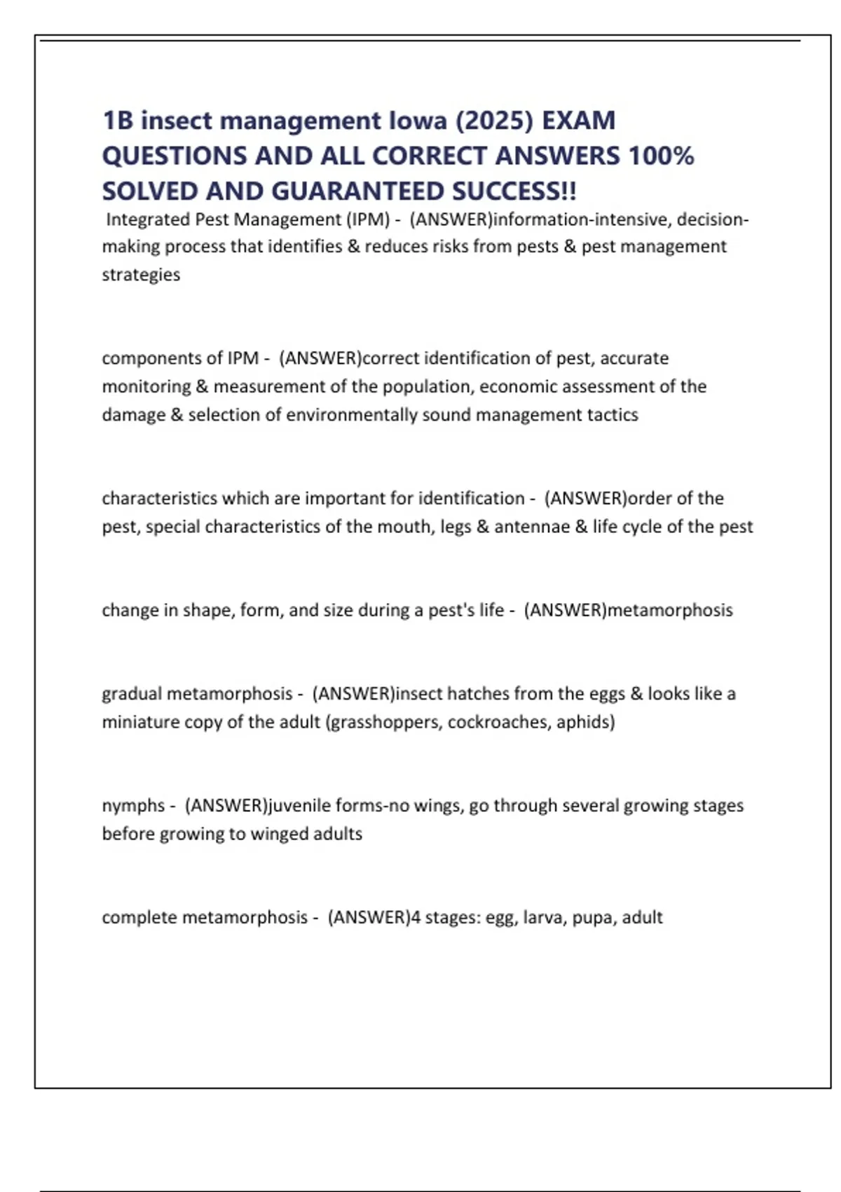 1B insect management Iowa (2025) EXAM QUESTIONS AND ALL CORRECT ANSWERS 100% SOLVED AND GUARANTEED SUCCESS!!