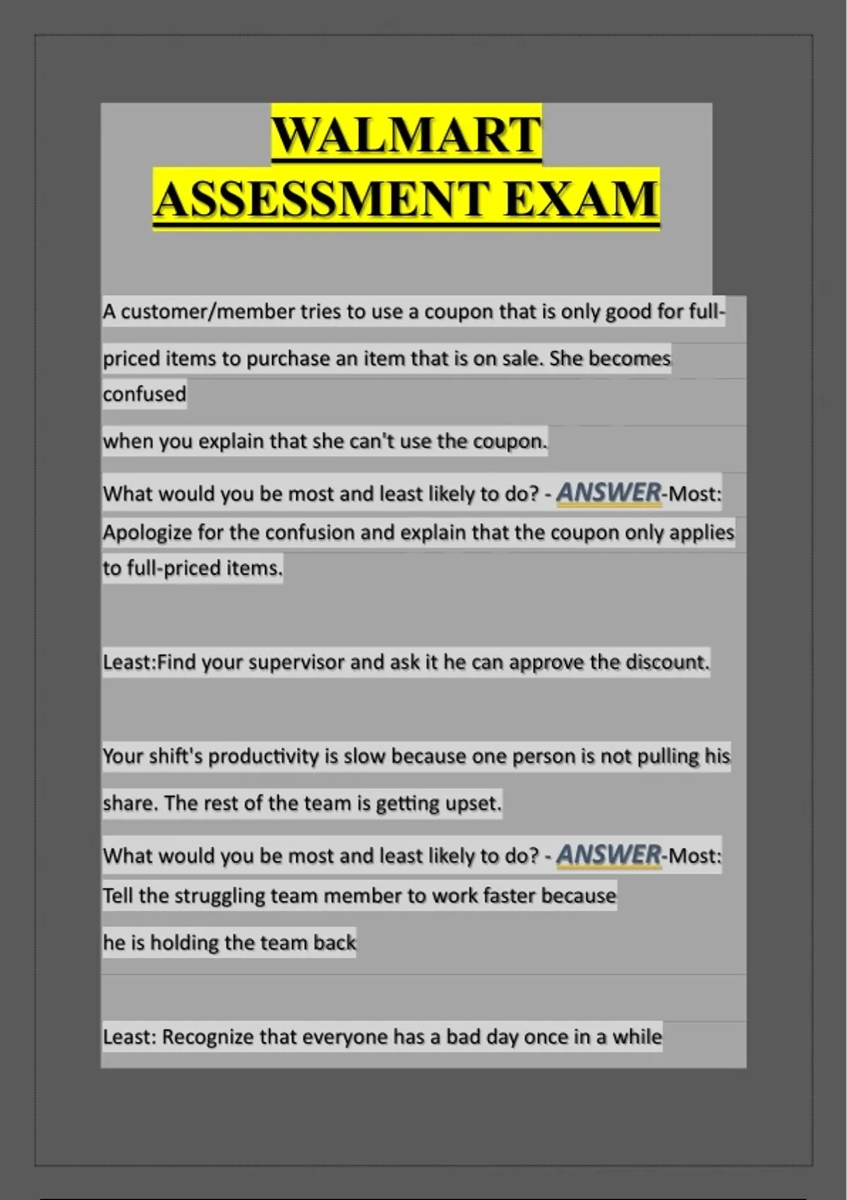 WALMART ASSESSMENT EXAM A customer/member tries to use a coupon that is only good for full- priced items to purchase an item that is on sale. She becomes confused when you explain that she can't use the coupon. What would you be most and least likely to do? - ANSWER-Most: Apologize for the confusion and explain that the coupon only applies to full-priced items. Least:Find your supervisor and ask it he can approve the discount. Your shift's productivity is slow because one person is not pulling his share. The rest of the team is getting upset. What would you be most and least likely to do? - ANSWER-Most: Tell the struggling team member to work faster because he is holding the team back Least: Recognize that everyone has a bad day once in a while