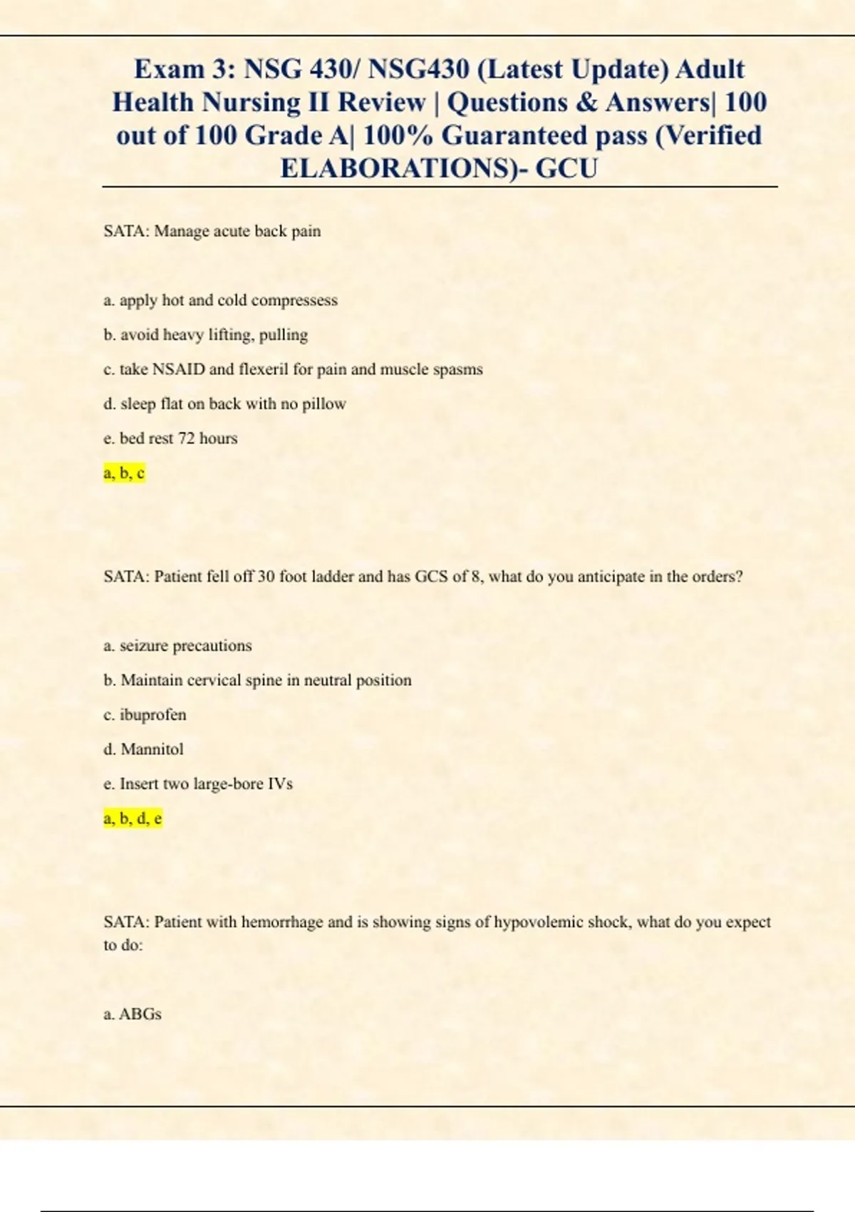 Exam 3: NSG 430/ NSG430 (Latest Update) Adult