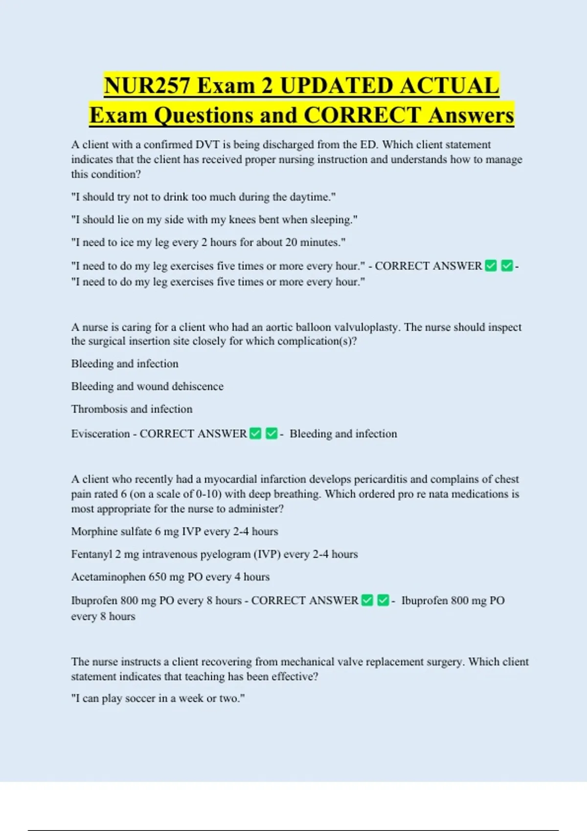 NUR257 Exam 2 UPDATED ACTUAL Exam Questions and CORRECT Answers A client with a confirmed DVT is being discharged from the ED. Which client statement indicates that the client has received proper nursing instruction and understands how to manage this condition? "I should try not to drink too much during the daytime." "I should lie on my side with my knees bent when sleeping." "I need to ice my leg every 2 hours for about 20 minutes." "I need to do my leg exercises five times or more every hour." - CORRECT ANSWER "I need to do my leg exercises five times or more every hour.
