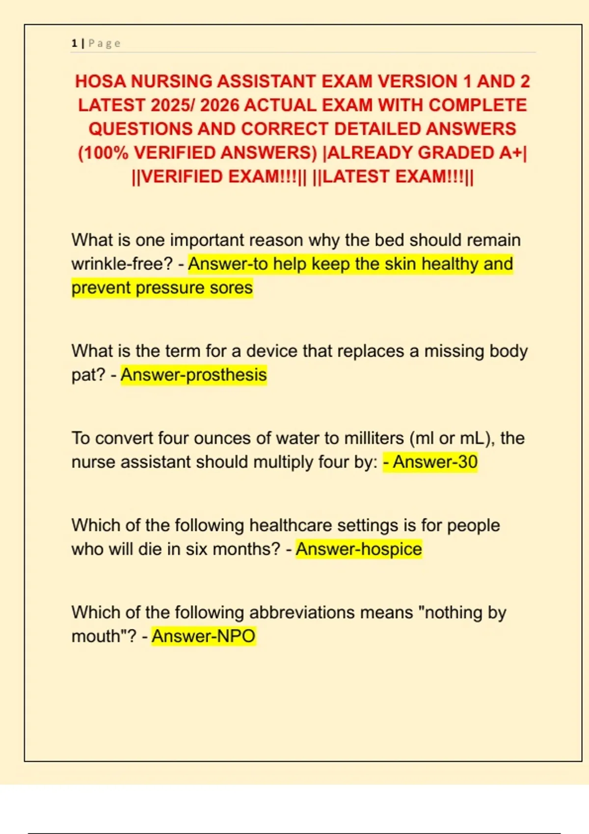 HOSA NURSING ASSISTANT EXAM VERSION 1 AND 2 LATEST 2025/ 2026 ACTUAL EXAM WITH COMPLETE QUESTIONS AND CORRECT DETAILED ANSWERS (100% VERIFIED ANSWERS) |ALREADY GRADED A+| ||VERIFIED EXAM!!!|| ||LATEST EXAM!!!||