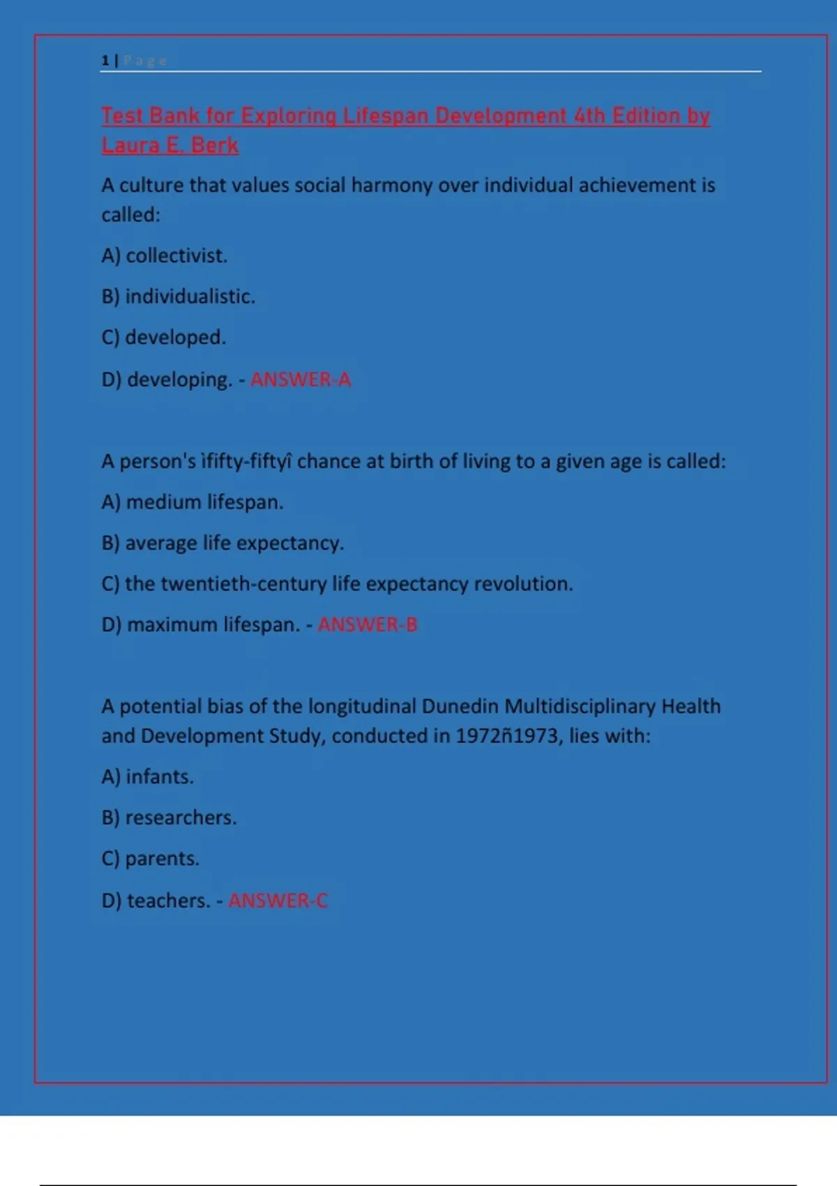 Test Bank for Exploring Lifespan Development 4th Edition by Laura E