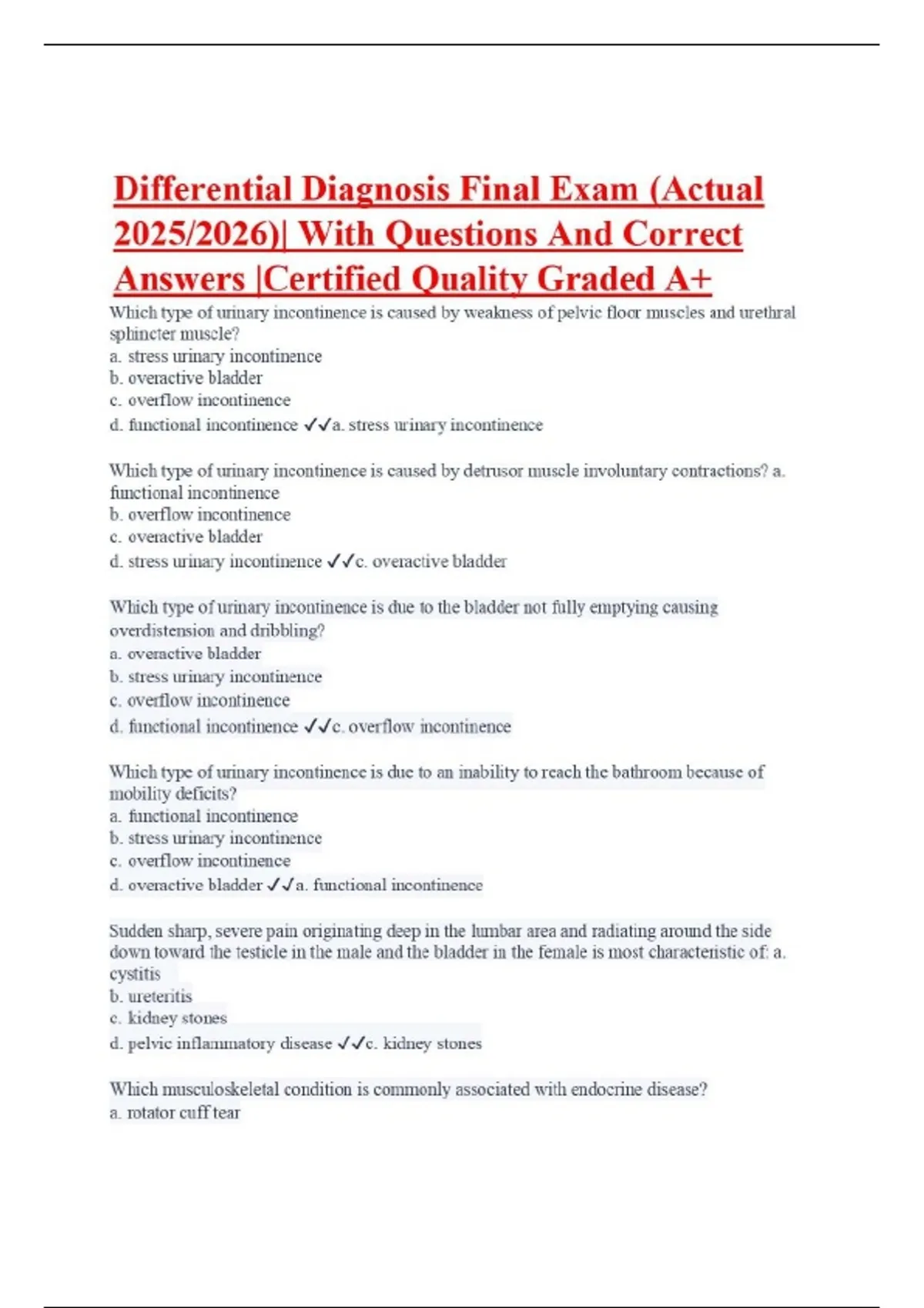 Differential Diagnosis Final Exam (Actual 2025/2026)| With Questions And Correct Answers |Certified Quality Graded A+ Which type of urinary incontinence is caused by weakness of pelvic floor muscles and urethral sphincter muscle? a. stress urinary incontinence b. overactive bladder c. overflow incontinence d. functional incontinence a. stress urinary incontinence Which type of urinary incontinence is caused by detrusor muscle involuntary contractions? a. functional incontinence b. overflow incontinence c. overactive bladder d. stress urinary incontinence c. overactive bladder