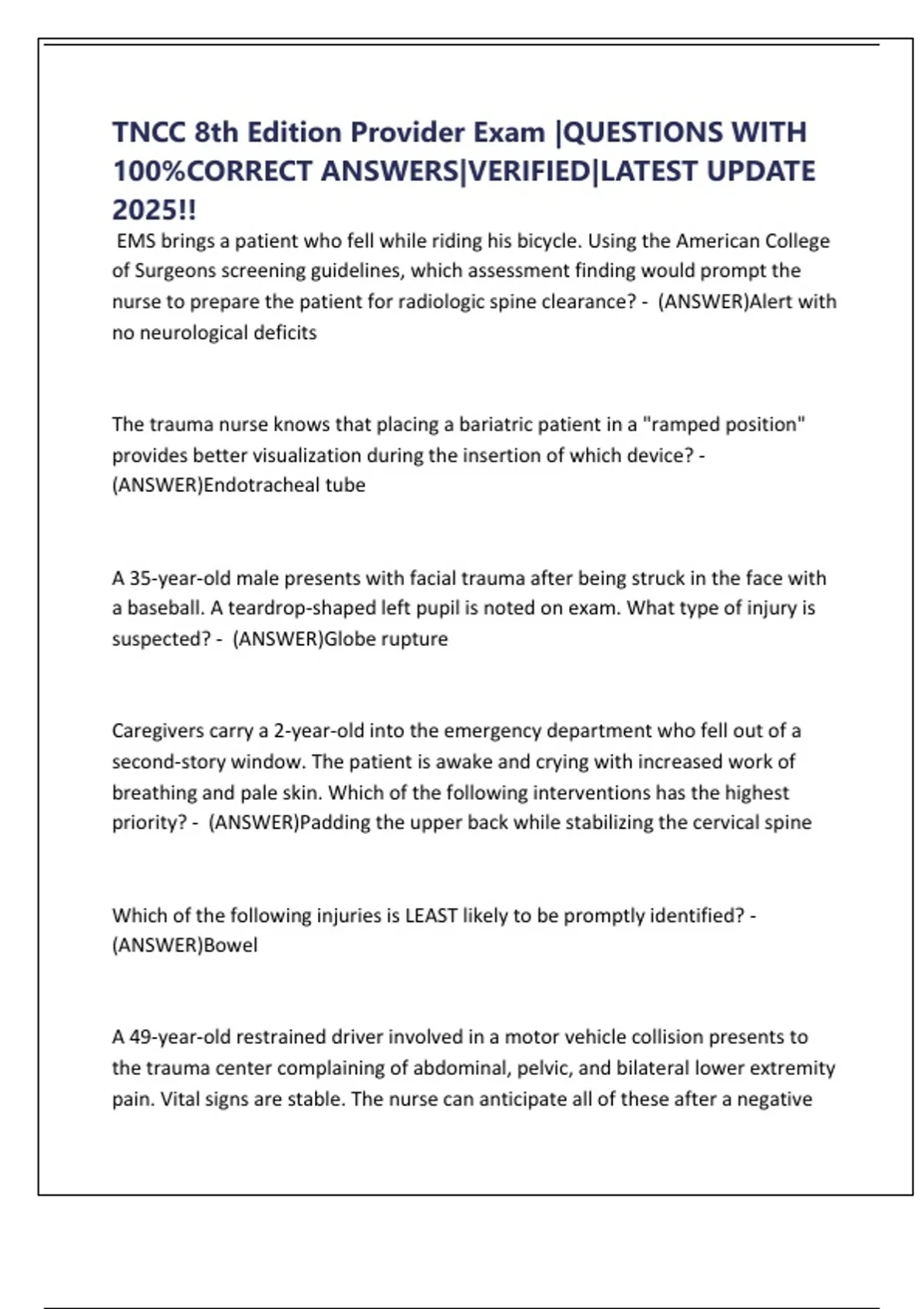 TNCC 8th Edition Provider Exam |QUESTIONS WITH
