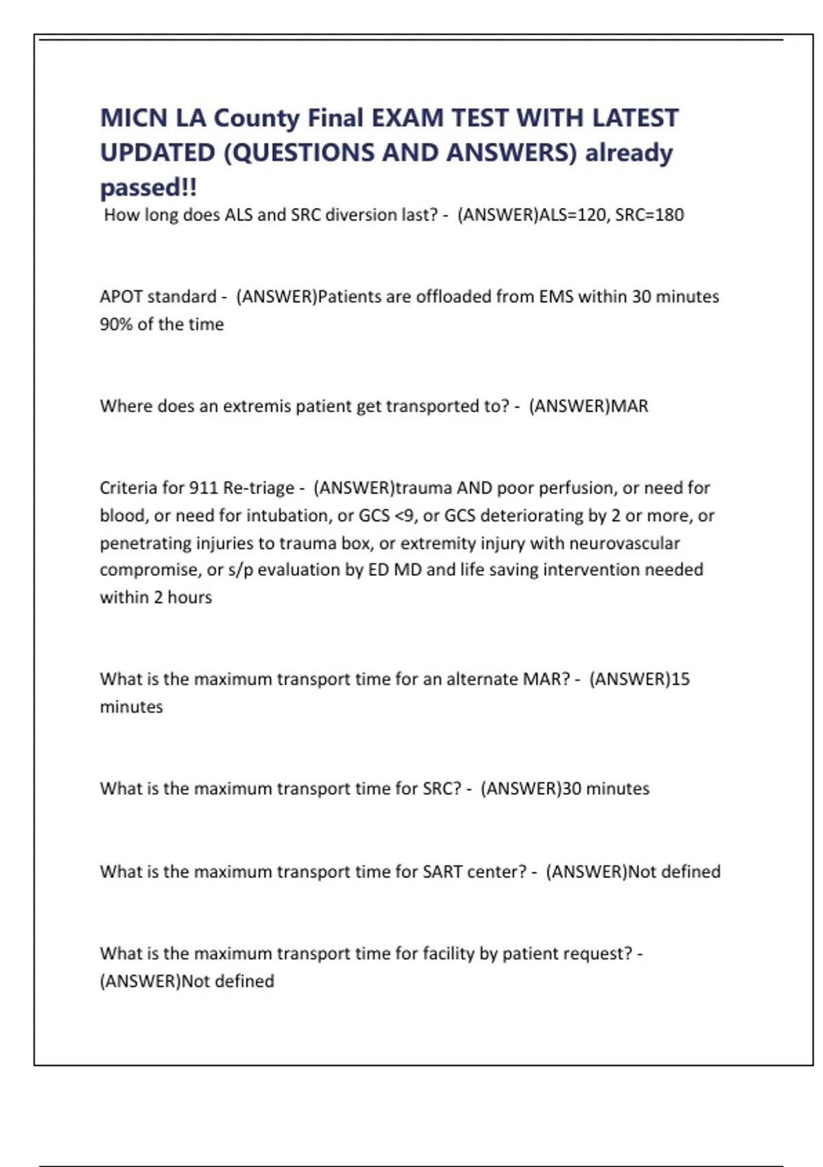 MICN LA County Final EXAM TEST WITH LATEST UPDATED (QUESTIONS AND ANSWERS) already passed!!