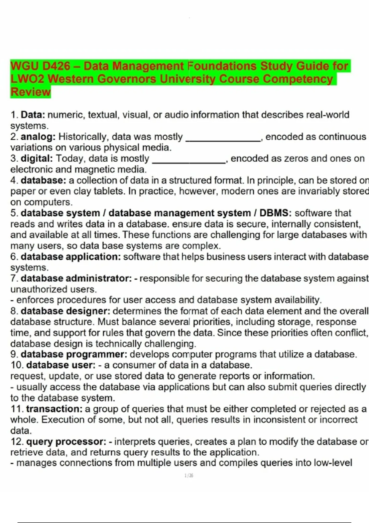 WGU D426 – Data Management Foundations Study Guide for LWO2 Western Governors University Course Competency Review.pdf